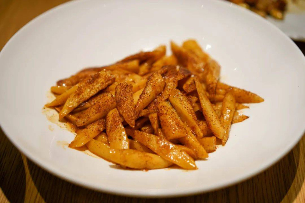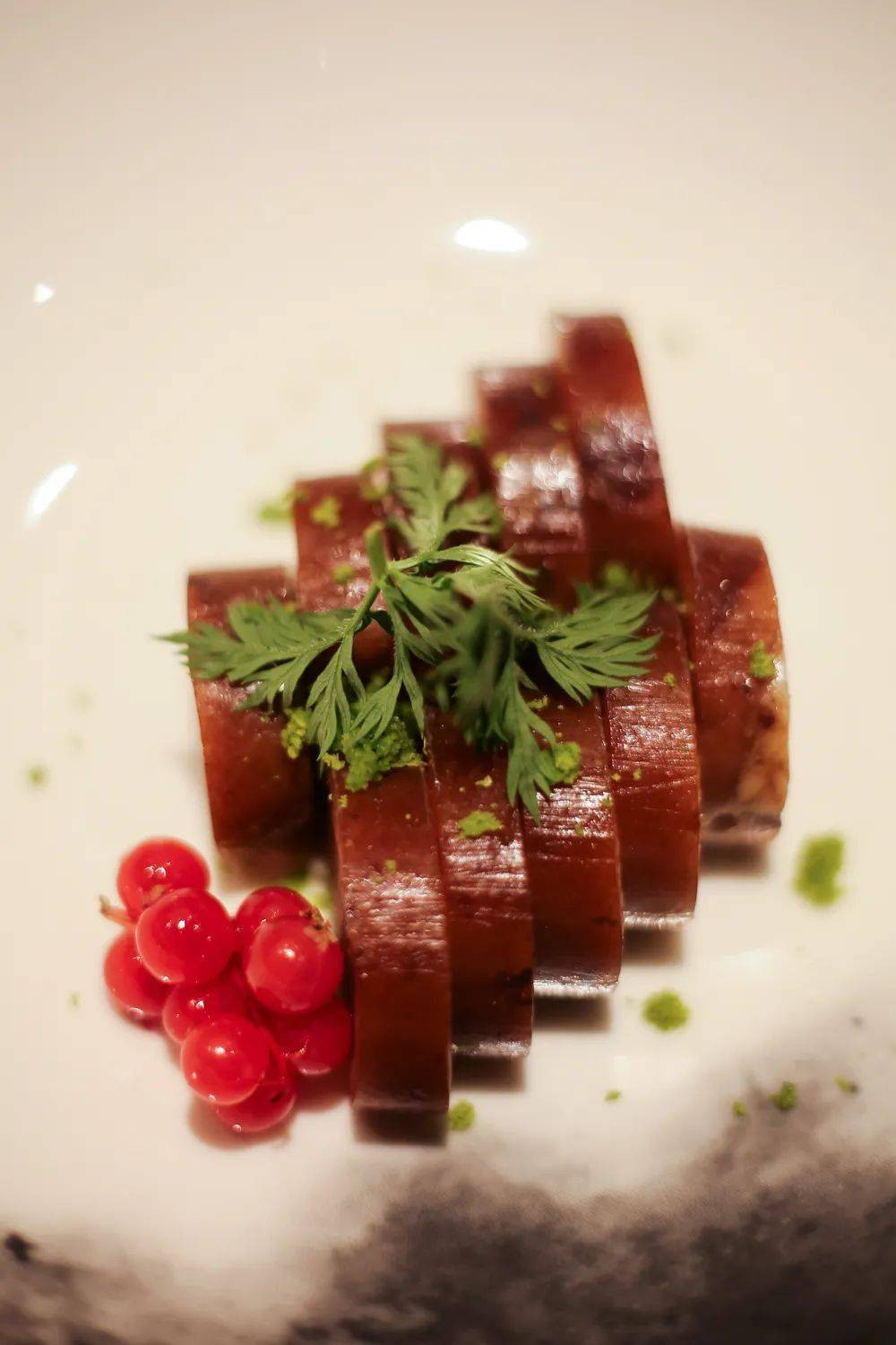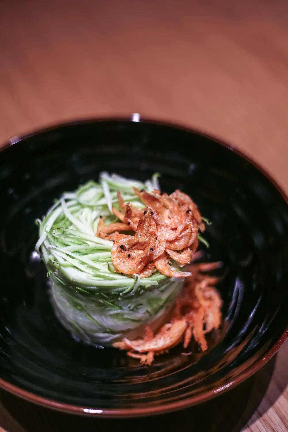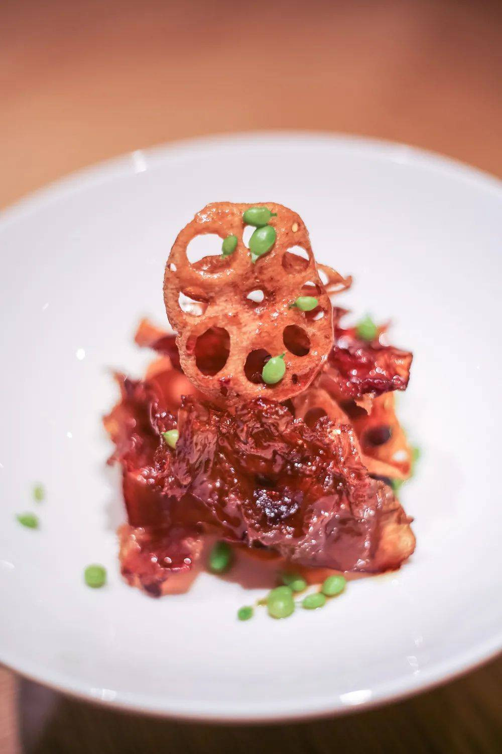 打头阵的是“冬趣四味碟”。搭配鱼子酱的青萝卜皮,薄如蝉翼的灯影牛肉,以樱花虾提鲜的节瓜丝,再到传统风味的酱猪肘,把经典食材做出了小巧精致又惊喜连连的味道。