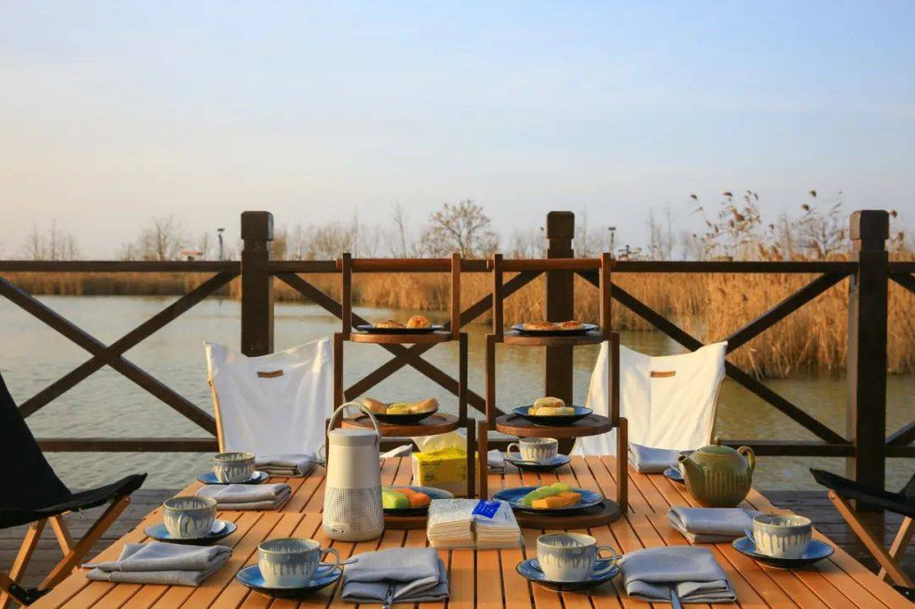 而当我们在这片湿地里走累了的时候,颐和湖畔的惊喜如约而至。在保护区的瞭望塔下,下午茶已经准备好。咖啡红茶、点心水果,对于又冷又有些饿的我们,是刚刚好的幸福。而上一次体验到这样的惊喜是在被誉为全球度假酒店天花板的Aman-i-Khas在伦滕波尔国家公园观虎时的“中场休息”。