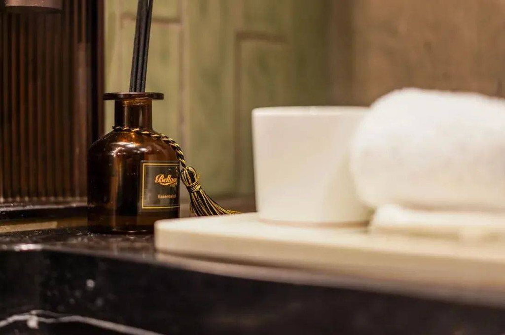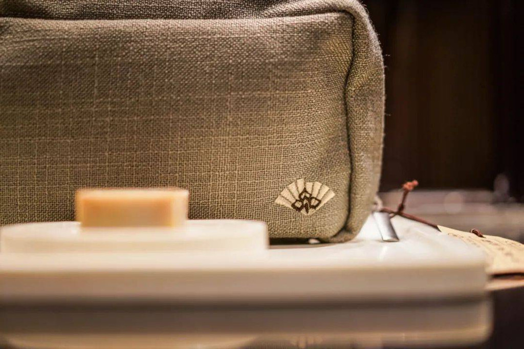 在卫浴空间里,木与石有了结合。铺有地暖的水磨石地面有着舒绵的脚触感,大理石台面上摆放着颐和标志性的洗漱包,一角的香薰散发着幽然气息,一切都显得柔和而温暖。
