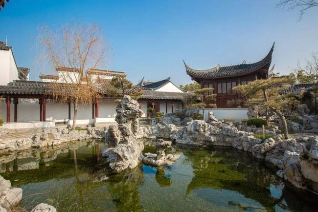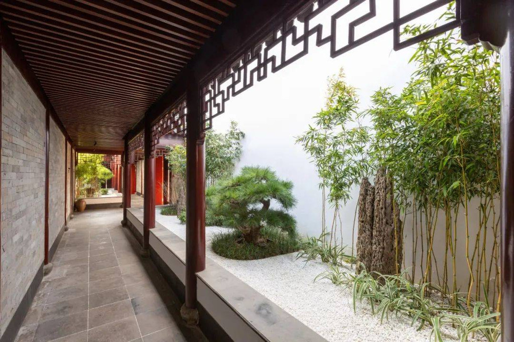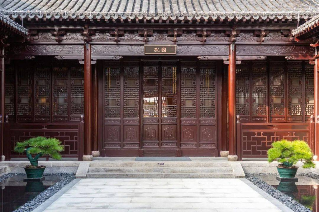 穿行在酒店的公共区域里,就仿若游园。“孔园”有着典型江南园林的要素,榭舫亭廊、叠山池塘,移步换景。