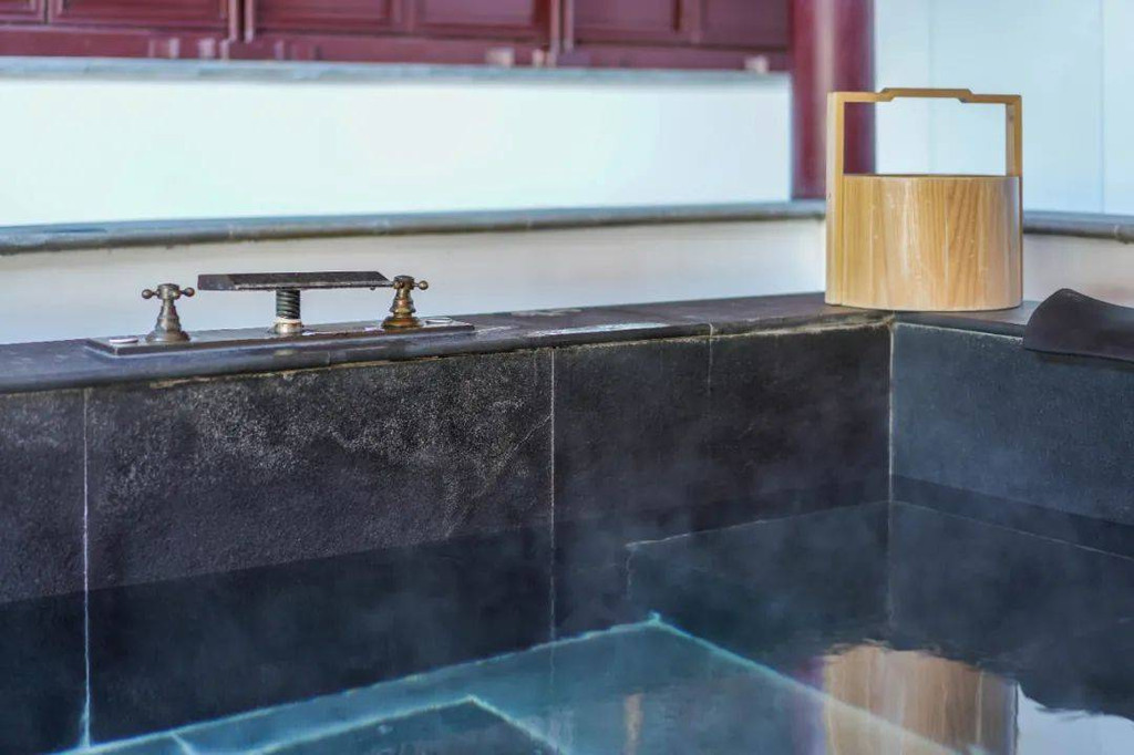 在这个冬夜,客房温和舒适,但我仍止不住心思地要推开房门走进院子,毕竟温泉私汤才是这个套房的精华所在。泡池极大,同时容纳4人完全不成问题,温泉口的出水速度也极快,七八分钟的时间即可装满一池。浸浴在大洋湾的温泉水里,皮肤瞬间凝滑,还有减轻疲劳的功效。晨起一次,睡前一次,已成为我宿于此间的必修课。