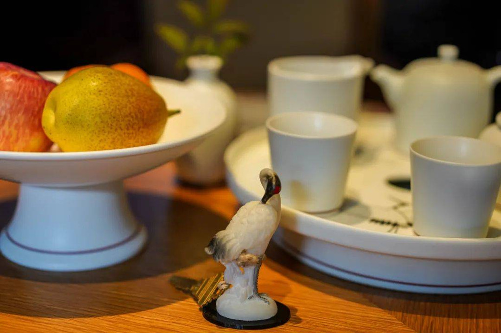 之前提到的两大精神元素,除了通过背景画来表达外,从茶托、床单被罩的暗纹,到卫生间里的装饰画,时刻在告诉我这里与鹤有关。