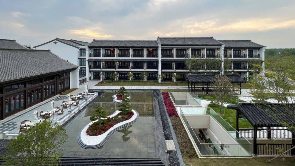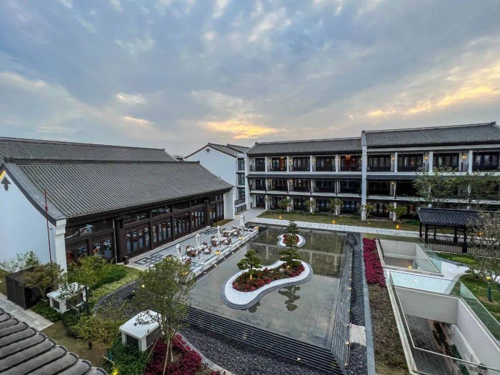 酒店的园林景观散布在各处,从主入口的迎客松开始,到落客区的回庭与水池,再到会议区的闻禅庭、大堂吧水景,直到最终以一个完整园林形式呈现的江南风格式后花园,保持着统一的风格和连续感。