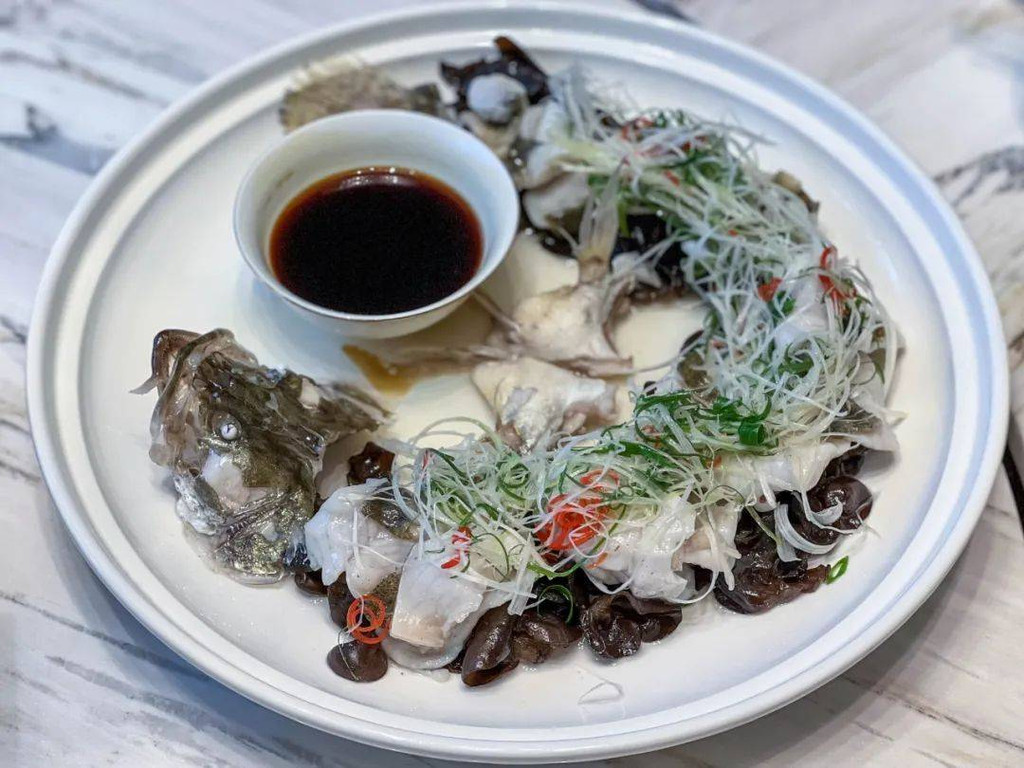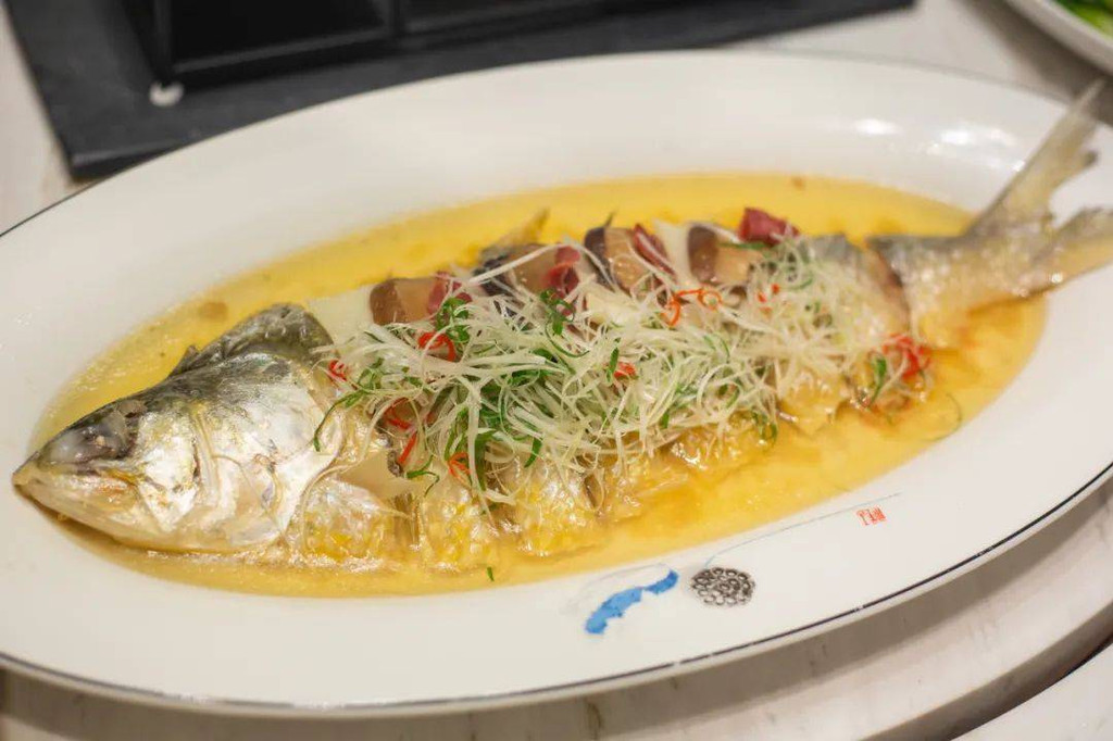 造型上别具一个,贴合了“盘龙”二字,采用广式豉油熟淋的做法突出了鳜鱼本身的鲜甜。