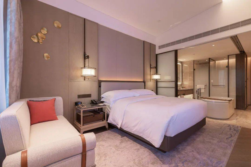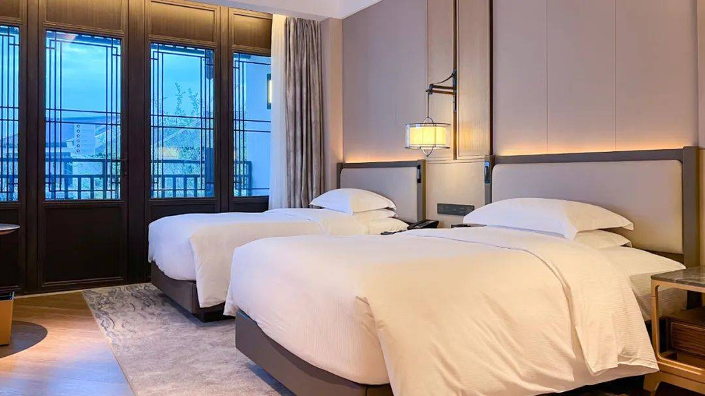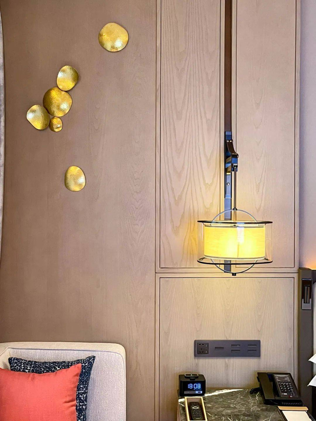 客房以原木、雅灰、浅棕等平和的色调,缀以水滴、云纹等自然化的图案。现代居家风格的家具配以新中式风格的壁灯等缀饰,留给客人一个亲切舒洽的休憩空间。