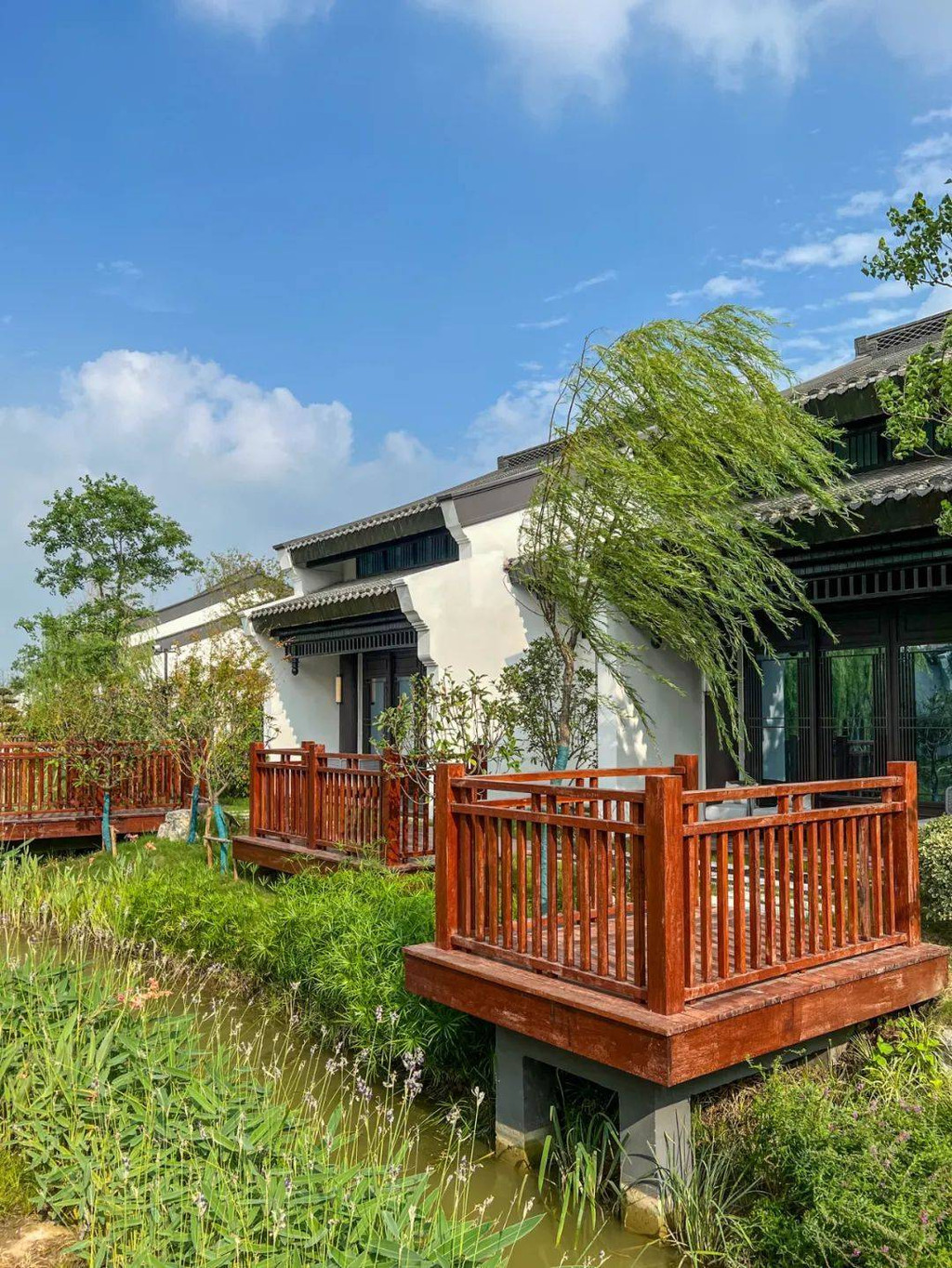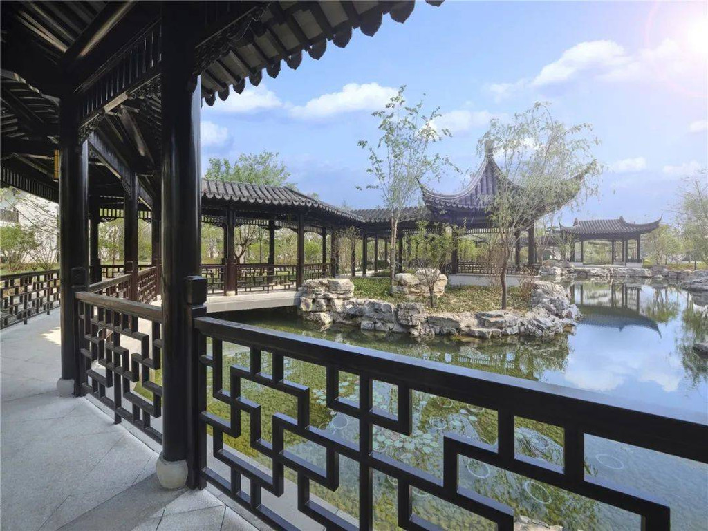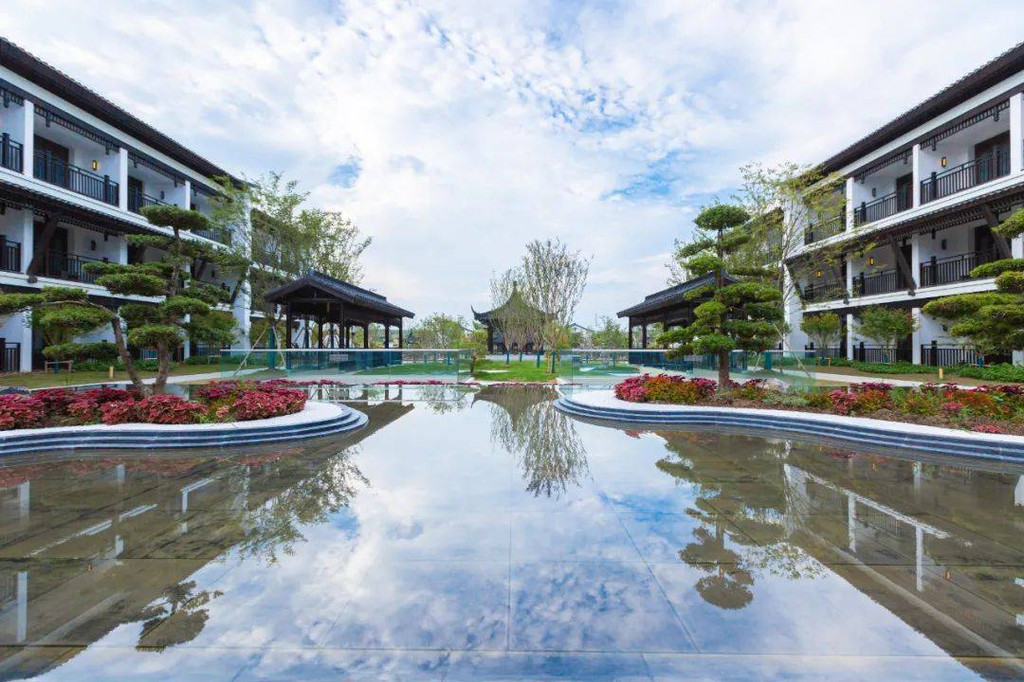 大堂吧水景近处为镜面叠水水池,池中点缀两个绿岛;中景落一“琴书亭”,展现出中式园林的对称美;远景与整个后花园融为一体,把住客的期待值拉满。