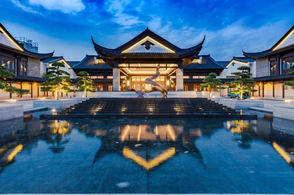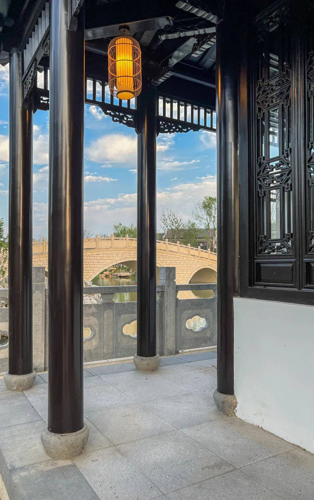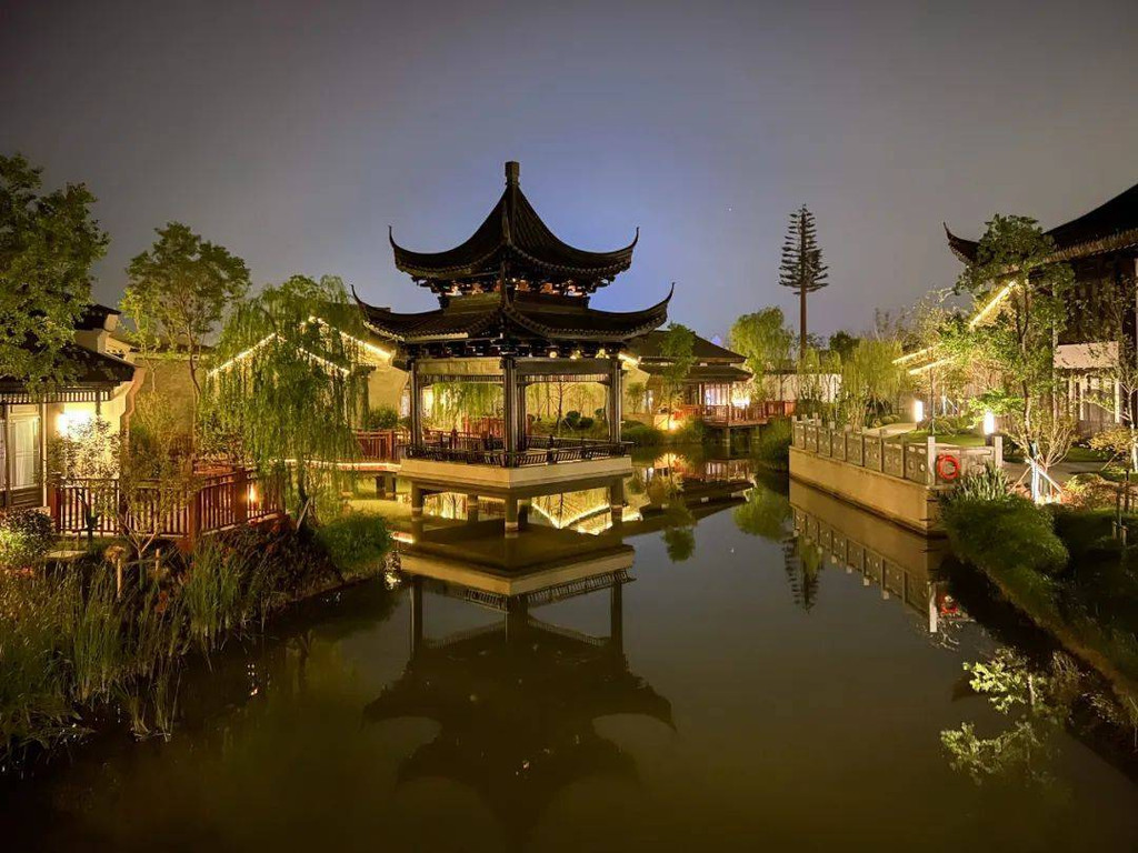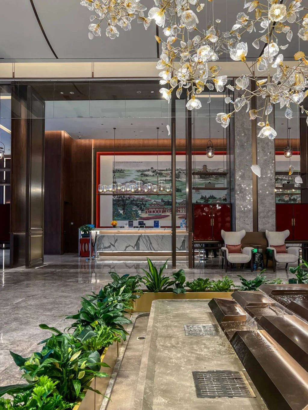 大堂吧水景近处为镜面叠水水池,池中点缀两个绿岛;中景落一“琴书亭”,展现出中式园林的对称美;远景与整个后花园融为一体,把住客的期待值拉满。