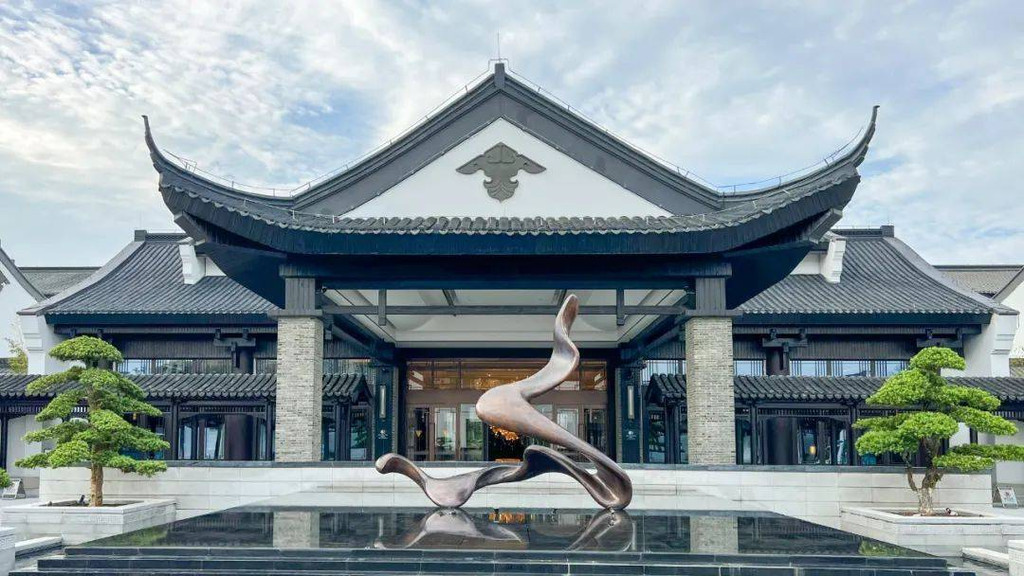 落客区的回庭以迎宾水池上的紫铜工艺品《水韵》为核心,造型在曲折中展现出大洋湾俯瞰的水系元素,充满了生气与上升的能量。