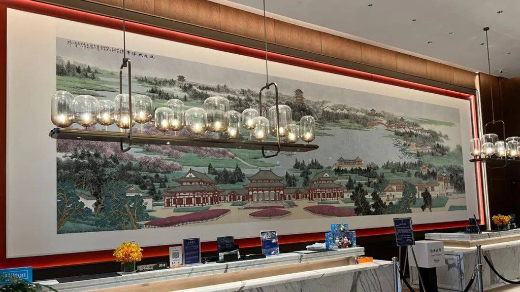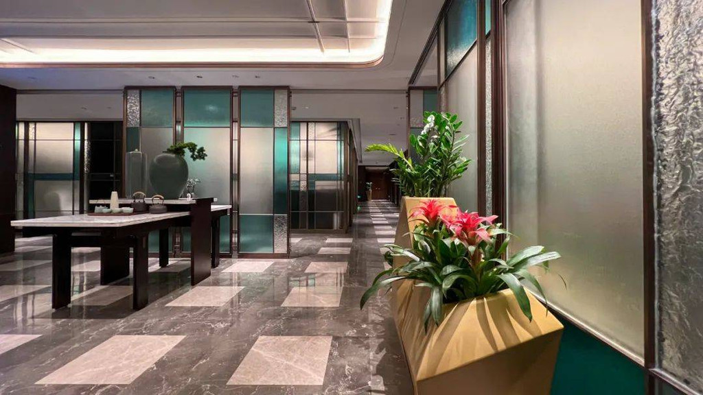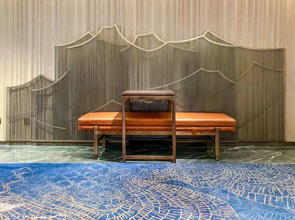 再比如,把江南民居斜坡顶与青瓦白墙的意境抽象成线条,展示在客房电梯厅与大堂吧的照壁墙上。