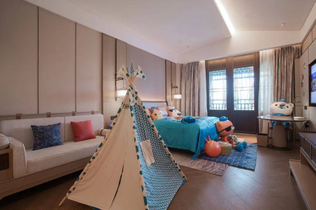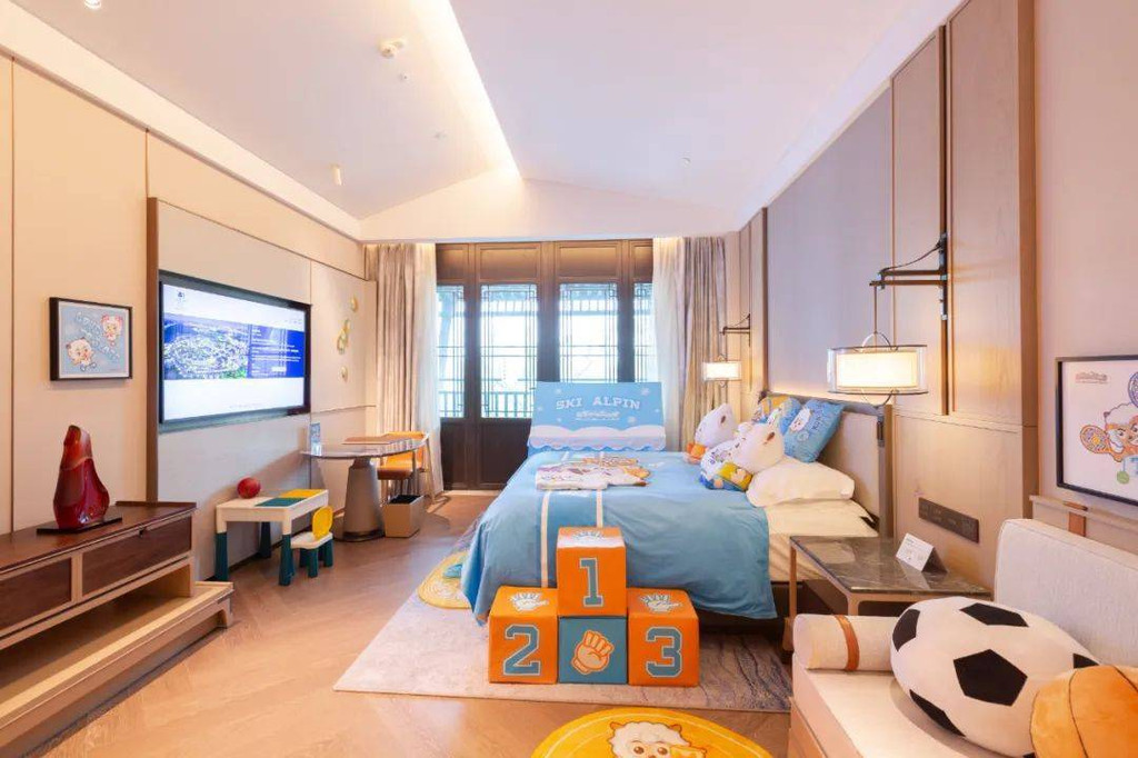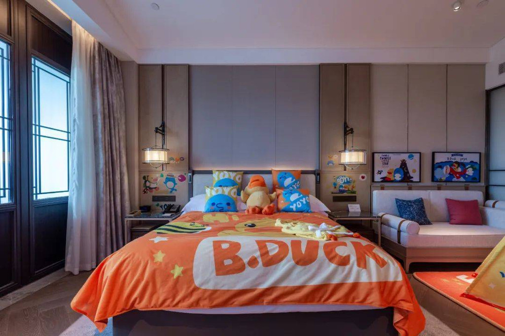 此外,酒店还设有多款为萌娃们打造的IP联名亲子客房,包括喜羊羊与灰太狼、小黄鸭、海底小纵队等。