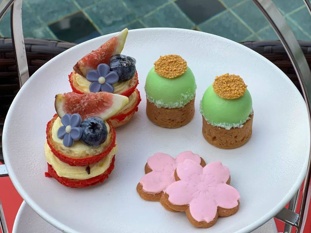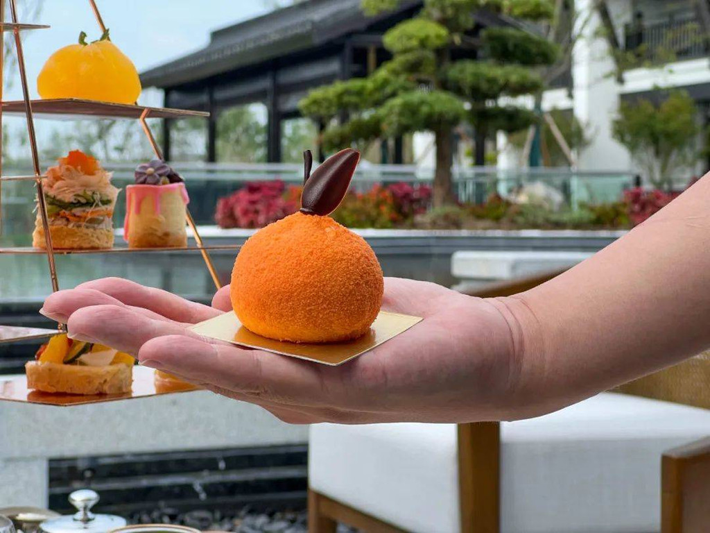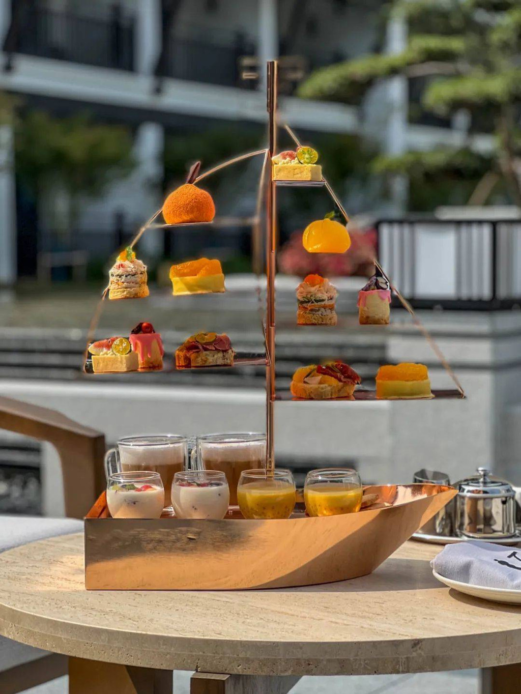 如果有一些轻食的需求,不妨挪步酒店的大堂吧。这里直面酒店中轴线上的水景,在风和日丽的午后,到大堂吧的户外区坐坐真是太适宜了。一杯咖啡,配上一份颜值颇高的下午茶,城市度假感满溢。