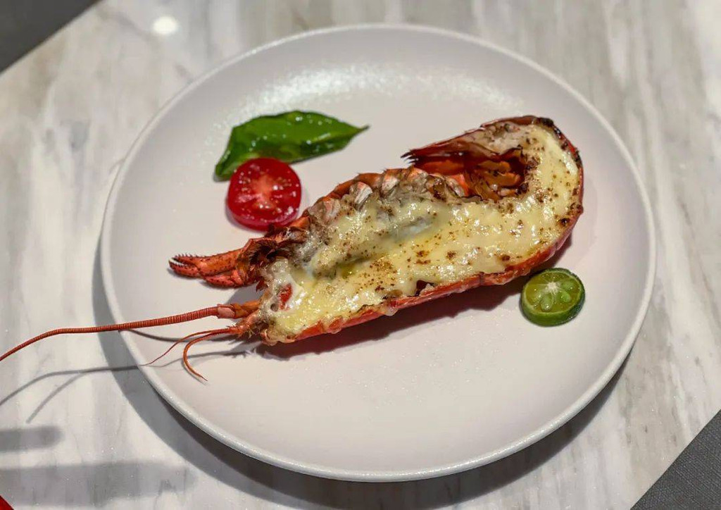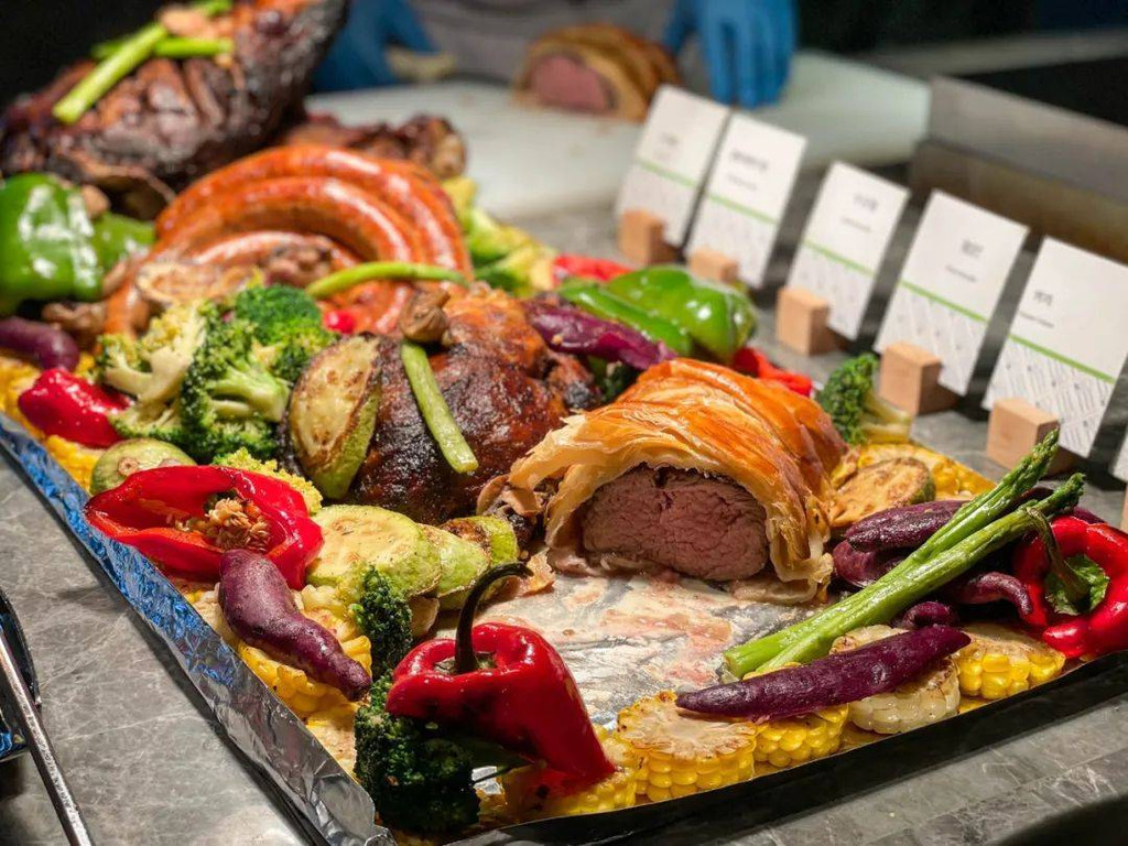 自助晚餐的品种非常丰富,海鲜、烧烤类一应俱全,惠灵顿牛排做得相当到位,绝对是西式烧烤的C位。作为主角的东海海鲜,种类不仅相当丰富,菜品增补也很迅速,完全不用去等去抢,每位还有单独派送的芝士焗波龙,这样的出品一位难求真的很能理解了。
