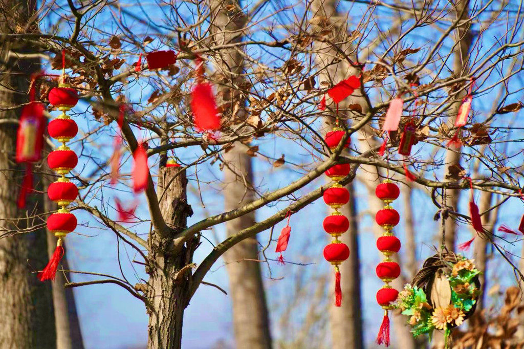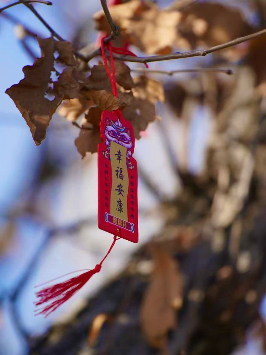 穿过桃花源牌坊,漫步在板栗大道上,两旁的树木上挂满了祈福牌和灯笼,红红火火的,年味十足,每一个祈福牌上都寄托着人们美好的愿望,我也不例外,写下了自己的心愿,轻轻挂在长廊上,祈求新的一年好运连连,满是期待和希望!