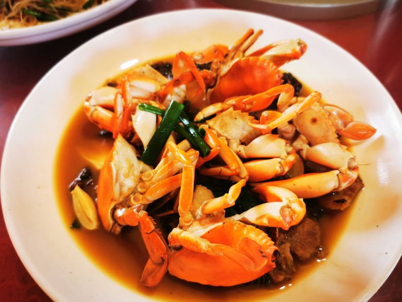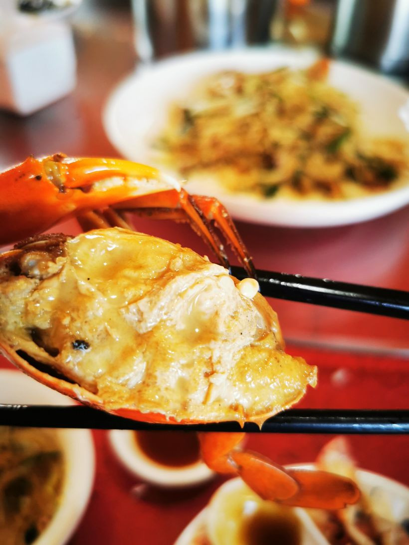 (不能或不吃蟹膏的可以把这个让给别人吃,这个也是很美味的),然后是横截面,因为那边和油直接接触的关系,那里的肉又香又有嚼劲,还有一些蟹膏参杂在里面。再进去一些就全部都是蝤蠓肉了,在肉的两边有壳,一边是腹部,一边是腮,腮和肉之间也有一层壳,这样肉就完美地被包在里面了。