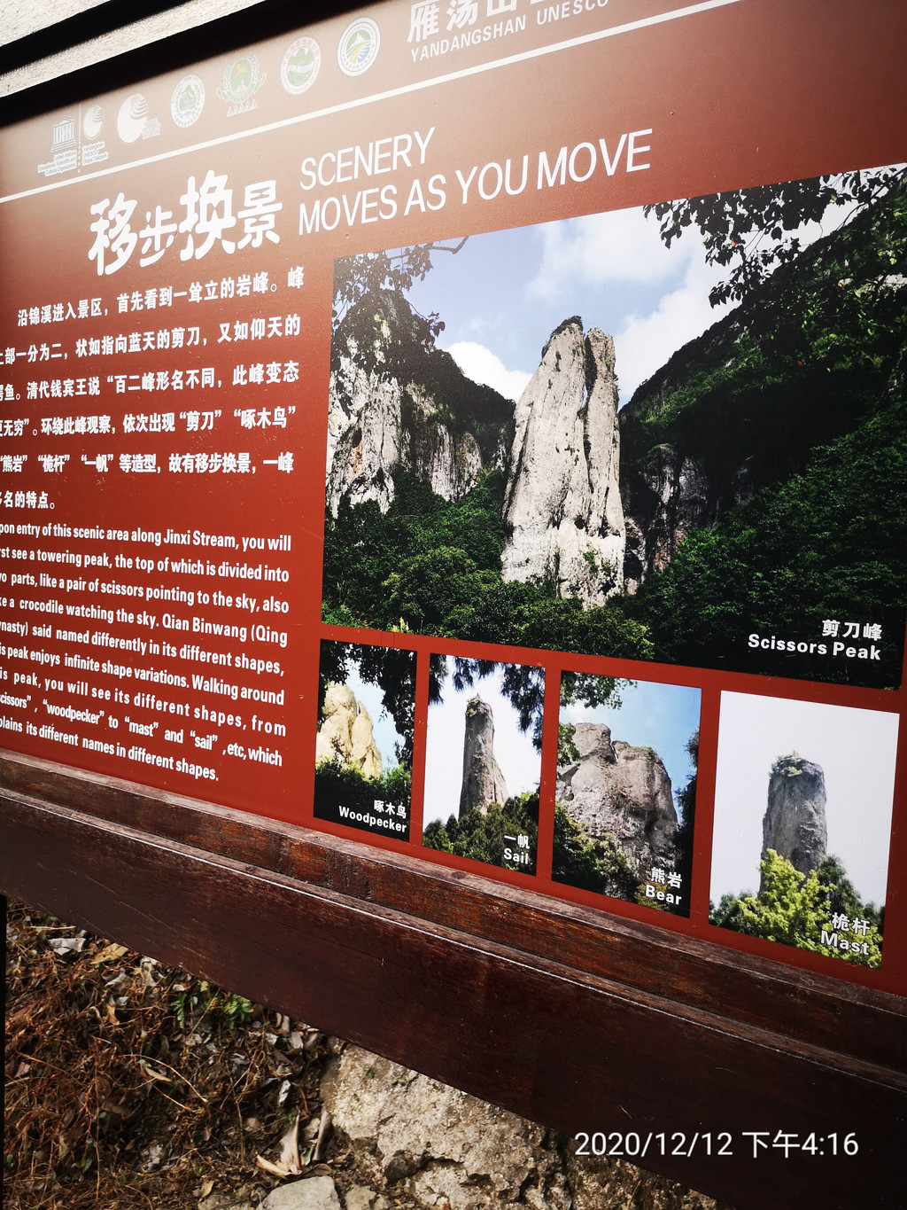1973年1月与夫人与游雁荡山,无人解说,只知道这个著名的山峰叫“一帆峰”,今日“补课”,方知:移步换景!导游不断提醒:像鳄鱼,像啄木鸟,像熊,像桅杆,像风帆 ......。一共有七八个之多,果然多趣。其实,其中的桅杆,更像广东韶关丹霞山的元阳石。