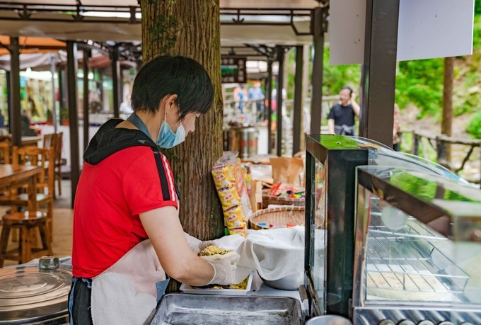 大龙湫瀑布看完后往回走是另一条路,有条小吃街,看到卖一种包了馅的很大一个饼,里面包好多馅,有鸡蛋、韭菜、豆干什么的,饼的名字叫麦油煎,味道超级棒,价格也不贵,记得好像10元一个,赞赞赞!