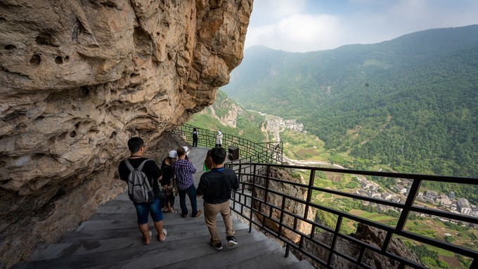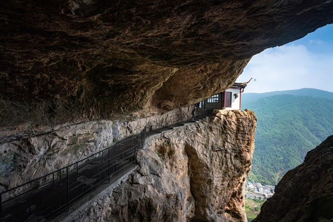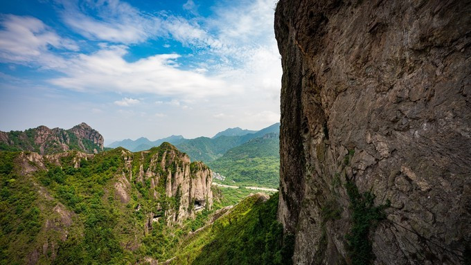 方洞之名源于各种神奇的天然古洞, 比如 关刀洞、梅花洞等等,其中以“方洞”称胜。沿着栈道一路行走,一边是深不见底的万丈深渊,一侧是千奇百怪的岩壁,而且不同洞口的高度也各有不同,有的高度让我们直接在岩石的下层中俯首穿行,有的视野辽阔令人产生“高处不胜寒”的错觉。行走在方洞栈道,时而凌空眺望,盘山公路如一条飘带蜿蜒缠绕,视野开阔;时而探身俯视,悬崖之下,满目苍翠, 雁荡山 山底观景尽收眼底。