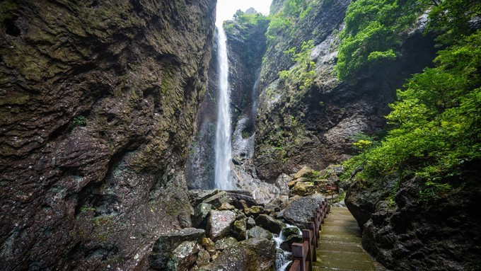 雁荡山 瀑布之多足以颠覆你的想象,大小龙湫、散水岩、三折瀑、西大瀑、 梅雨瀑等等,平日里恰似万绿丛中的素练萦回,飘逸缠绵,妩媚动人,可若逢雨季,只见满山群瀑舞动,如蛟龙如水、银河倒垂,溅玉飞珠,令人遐思翩翩。其中最有名的当属“雁荡三绝”之一的大龙湫。号称“天下第一瀑”的大龙湫瀑布,早在宋代就享有盛名,徐霞客曾在游记中写道:“怒涛倾注,变幻极势,轰雷喷雪。”近200米的落差,使其与 贵州 黄果树、黄河壶口、 黑龙江 吊水楼并称 中国 四大瀑布。不过今天我们不说久负盛名的大龙湫,而是说 雁荡山 另一处飞瀑奇观,被誉为“雁山第一胜景”的三折瀑。