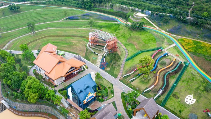 园内现拥有花海溜溜、世界风溜溜、虎溜溜、溜溜塔等66条溜溜滑道。虎溜溜是 亚洲 最长的滑轨溜溜,全长1620米,也是目前 亚洲 唯一拥有三立柱盘旋的轨道。过山车大家都玩过,那山地过山车的惊险刺激是来这里最值得体验的项目。滑道穿梭在百花海、百花林、百果园之间,陡坡、弯道的刺激体验让你挑战高度与速度的双重冒险。高达61.8米的溜溜塔也是 亚洲 最高的溜溜塔。溜溜塔一共有八层,这是一个存在于二次元之外魔法空间,悬挂式AR飞行影院、旋转木马、自由落体、动漫嘉年华、灯光秀、酒吧、球幕影院。在最高160米的溜溜滑梯入口就在最顶层的八楼。