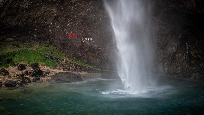 上折瀑虽与中折瀑有异曲同工之妙,但却更加的雄伟粗狂、壮丽幽深。它位于白云深处,深藏群山之中,四周峰峦叠嶂、林木葱笼,曲折迂回、时隐时现的山路石阶,令多数游人望而却步,因此也更具神秘感。只见一挂飞瀑从高约百米的洞顶撒入碧潭之中,白练长垂,四壁临空,犹如一束白光直射水潭。