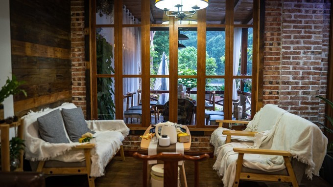 位于山林之间,所以装修风格以亲近自然为体现,采用本地木材,各类灯饰也被竹编外衣或者草木包裹起来,典雅中又透露着亲切,身处其中,远离城市喧嚣,回归山林之间,伴田野清风,入梦!