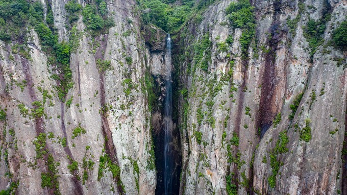 入景区不远处便可达有“天下第一门”之美誉的显胜门。只见两面陡峭崖璧对峙而立,雄伟峭拔、直入云霄,就像两扇巨大的石门矗立在世人眼前。两石门高约百丈,中间间隔仅十余米,及至崖底,抬头仰望,只见两崖顶壁复合,仅留一线,“非中午夜分,不见日月”,像极了我们常说的“一线天”。穿行其间,只感觉凉风习习,光线幽暗,深邃静谧,别有洞天。拾级而上,只见悬崖岩褶中一条白练飘然而下,或激越,或舒缓,水量不大,姿态婀娜,这就是著名的“含羞瀑”,又名“飞湫”,与大龙湫、小龙湫并称北雁“三湫”。瀑下水潭清可见底,据说是剧中小龙女的沐浴之所。