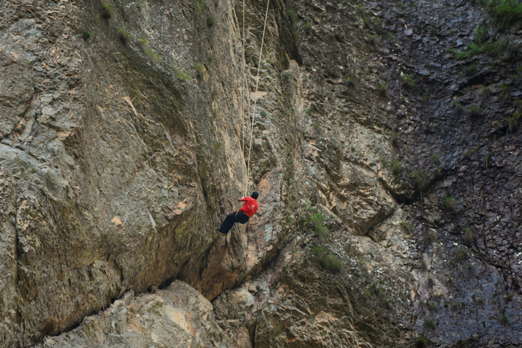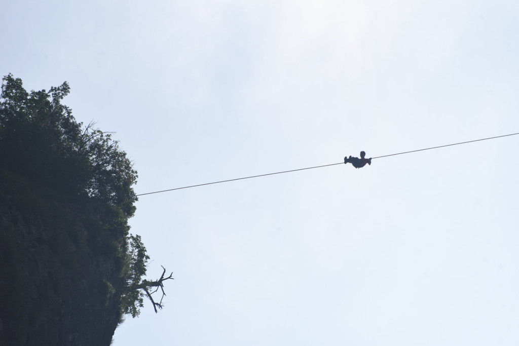 雁荡山有三绝,灵岩飞渡是其中之一,这里的灵岩飞渡表演非常值得一看。 当大家还在灵岩景区内欣赏这大自然的壮丽秀美之时,时间接近10点钟已到“灵岩飞渡”表演的时间了,无论是刮风还是下雨这里都会有精彩的飞渡表演。先是一人从高空依靠一根绳攀岩而下, “游走”在雁荡山的悬崖峭壁间,还来几个惊险动作,或是一鼓作气一溜下至岩壁几十米高度,到最后稳稳落地,毫发无损。刚刚看了高空攀岩而下的表演,又见在天柱峰和展旗峰的峰顶上拉有一条绳子,高达200米,宽亦200多米,可谓世界罕见。人在绳子上表演翻跟斗、飞翔等动作,堪称一绝。 拉在两峰之上,高约200米,长约200米的绳索上攀爬而过,时而上演翻跟头、飞翔等动作,不禁让驻足的观众啧啧称奇。 据了解,灵岩飞渡表演于1916年,最早起源于农民上山采草药,后来演化成现在的高空飞渡表演,在天柱峰和展旗峰之间悬挂着一根纲索,表演人员除了横空表演外,还在270多米高的天柱峰顶用缆绳悬空而下表演。
