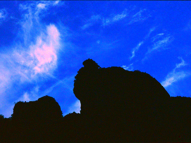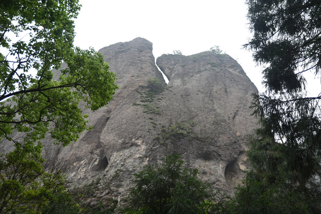 还有著名的夫妻峰。仰望这两座山峰拔地而起,左边是妻子,烫着微卷的头发,身上穿着和服;右边是丈夫,刚刚从远方回来,还来不及把包袱放下。他俩互相拥抱,正窃窃私语着,好像在互诉离别之情。
