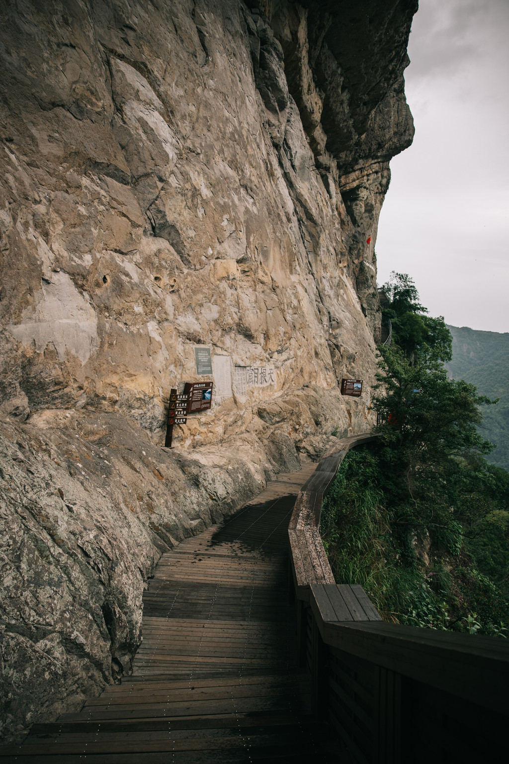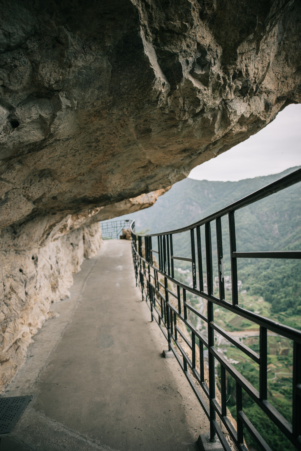 这是一处在高达百米之上的悬崖峭壁间开凿出来的,名为方洞栈道,又称“银崖天廊”,栈道就像一条腰带挂在半山腰。