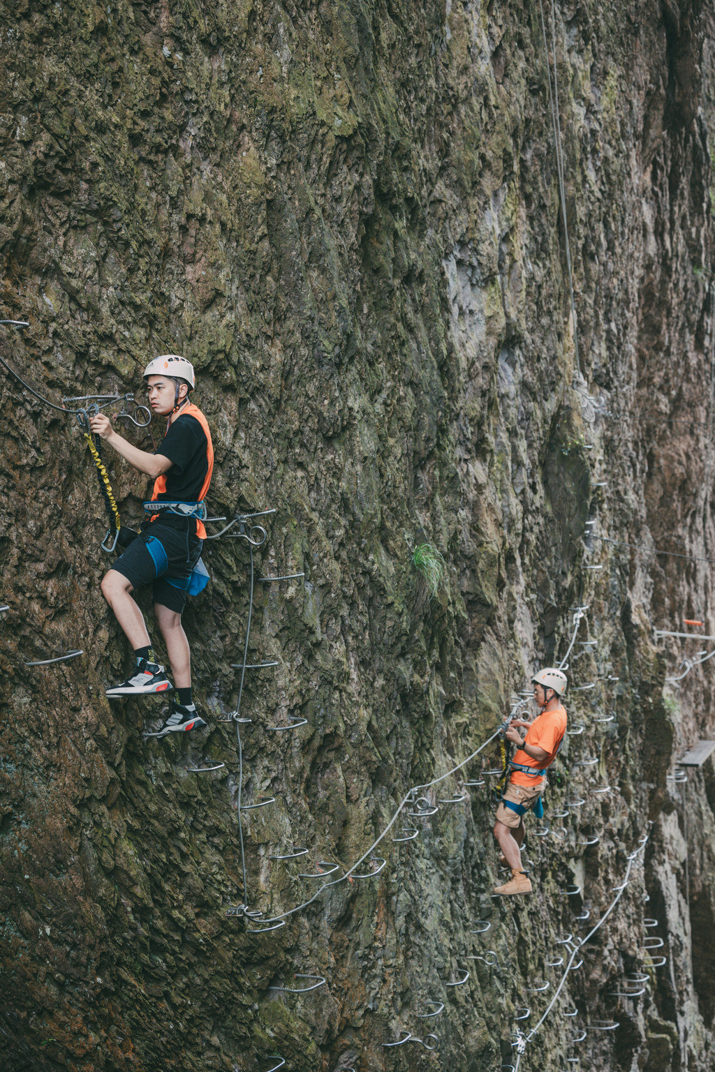 雁荡山飞拉达严格来说是分成两部分,登山+铁索攀岩。登山这一段有点长,大约要爬半个小时的台阶,后面的攀岩项目分成3个等级,A线400米为休闲观光路线,B线900米为难度挑战路线,还有一条体验线路C。