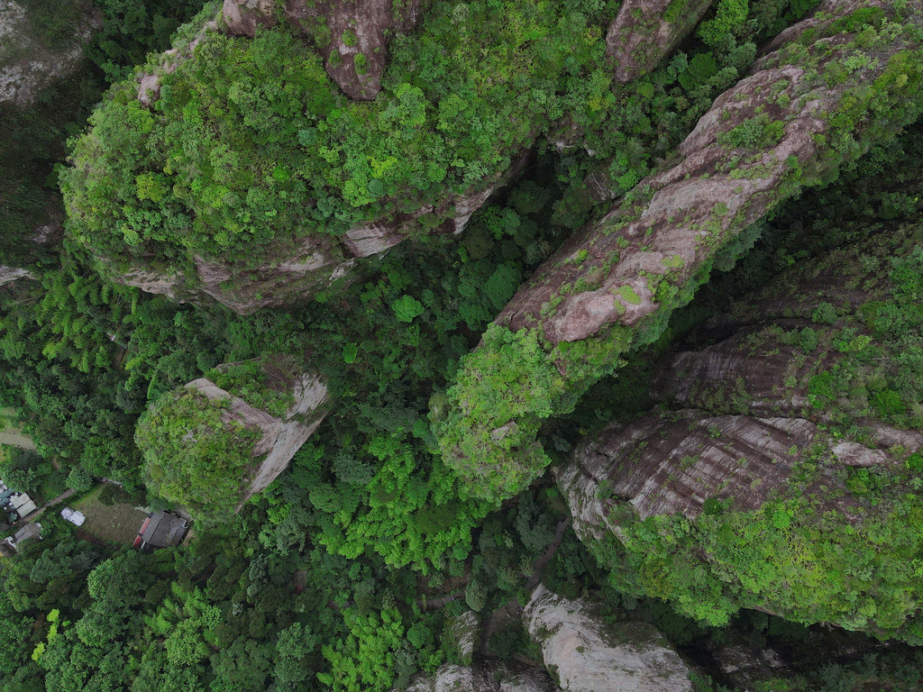 立于桥上远眺四方,自有一览众山小之感。东面奇峰怪石,神态各异,南面众山绵延,云雾缭绕,时隐时现,俯视下去,农田屋舍连绵成片,视野开阔,美不胜收。