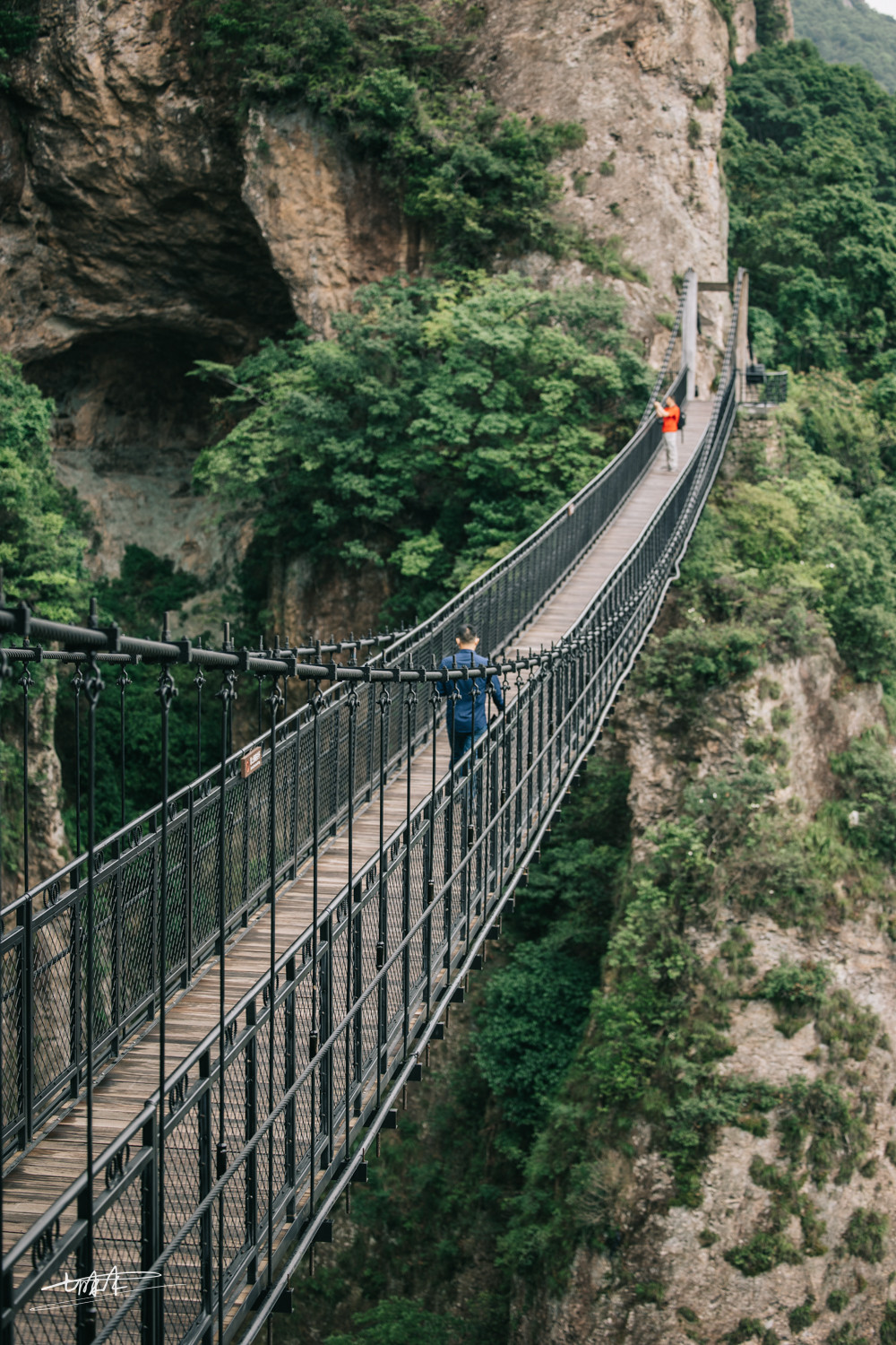 这座长约百余米的天空之桥,建于两崖之间,离地面足有200米高。在铁索桥上行走,铁索晃荡,多了几分惊险与刺激。胆小的,还会尖叫几声。