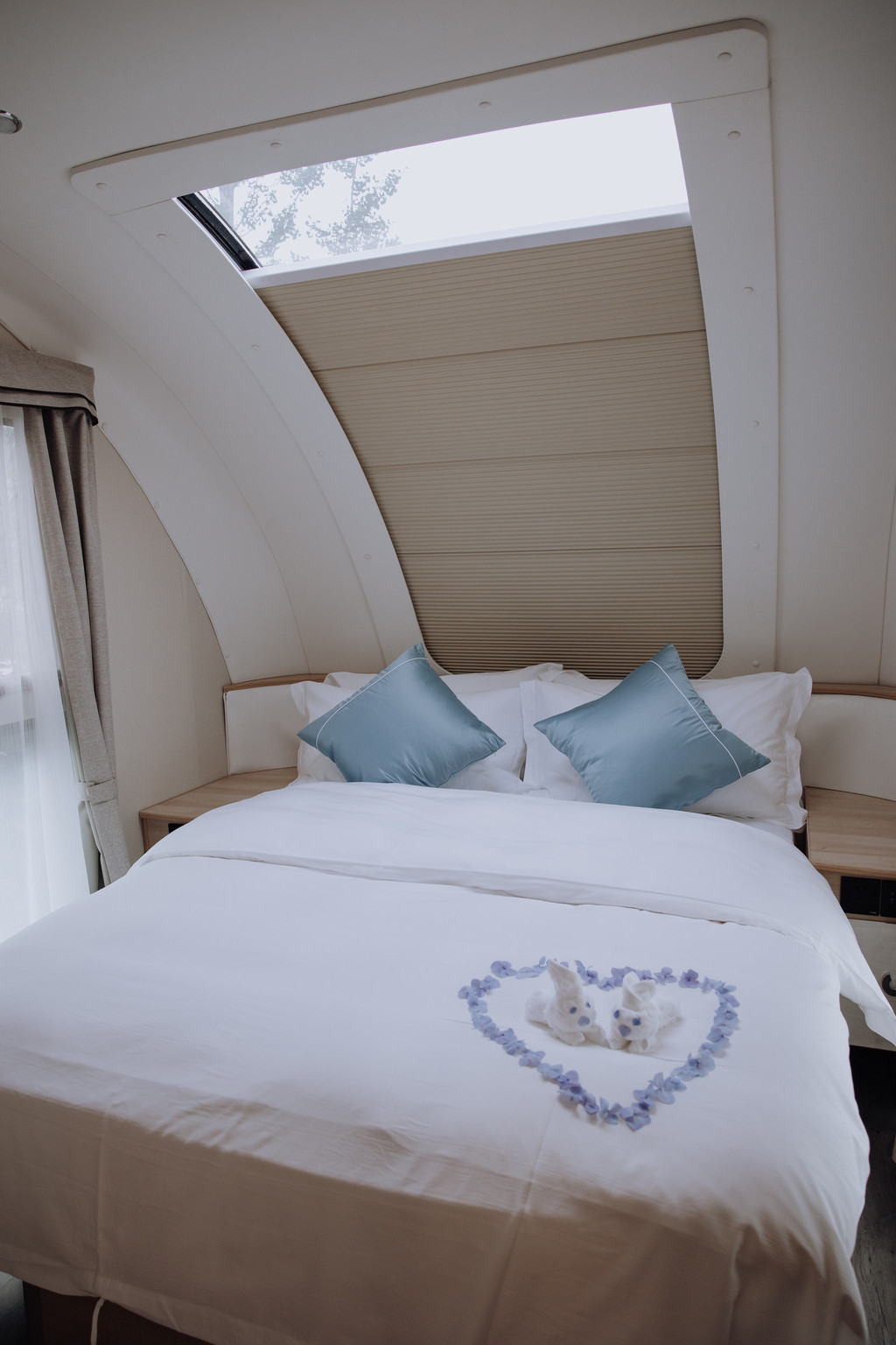 营地内有亲子--星空庭院房、休闲-棋牌庭院房、雅趣--KTV庭院房、行政商务庭院房等各类房型。极具时代科技感的房车设计,把奢华的住宿空间和原始自然的外部环境融为一体,开门见景,沐浴阳光。