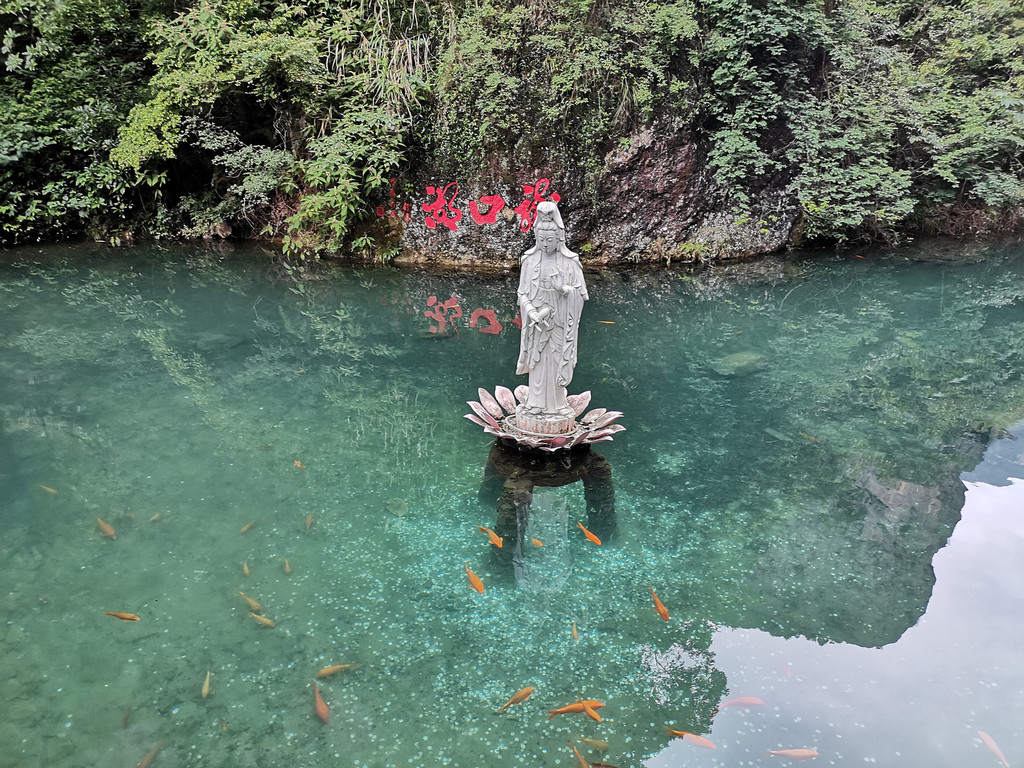 上图为灵岩景区从玻璃栈道上来后看到的观音,碧水红鲤。