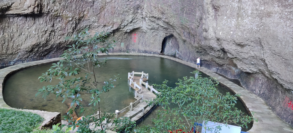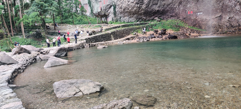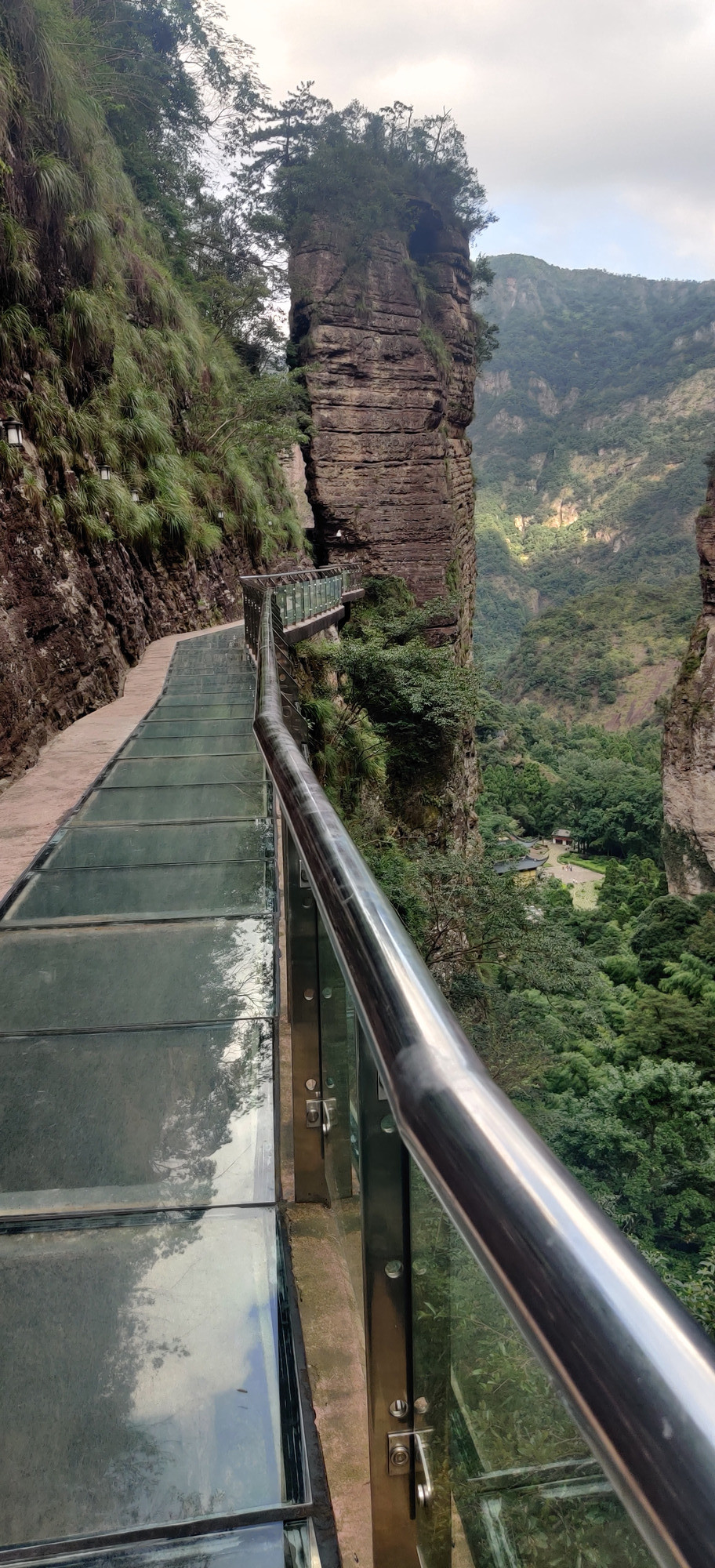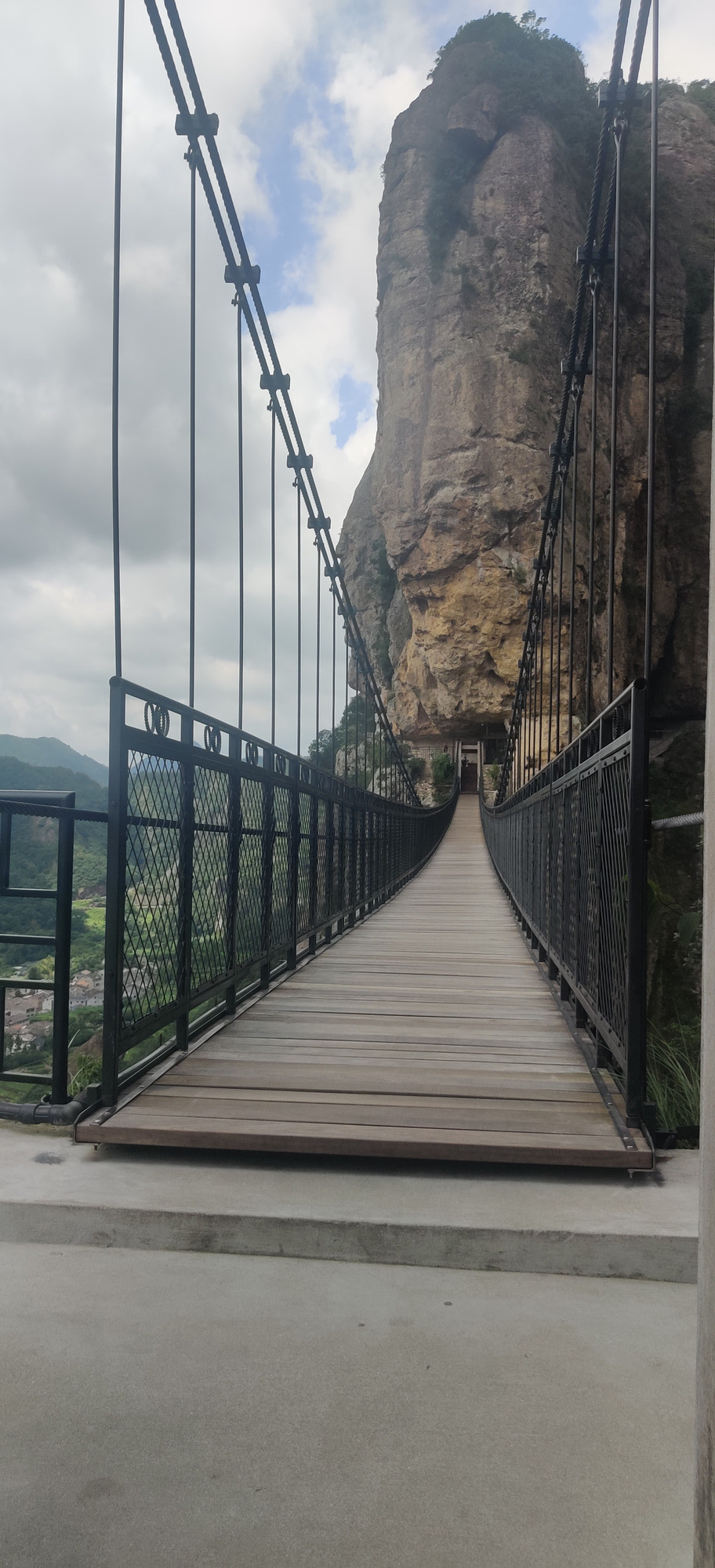 到现在游完大龙湫和方洞就差不多中午了,我们回到住所吃了午饭午睡,下午去了灵岩,坐大巴约十分钟,刚好赶上下午三点那场飞渡表演,在路上找一个避开树叶的观看点,看对面的山崖上的师傅从崖顶凌空而下,整个表演大概几分钟的样子,但别着急走开,另外一个方向还有一场高空绳索的表演,然后向上走约半小时到玻璃栈道,在向里走几分钟是卧龙谭,可惜还在施工,然后向下走,约十五分钟到小龙湫,然后就出景点了,整体来说比上午的大龙湫运动量稍微多一点。
