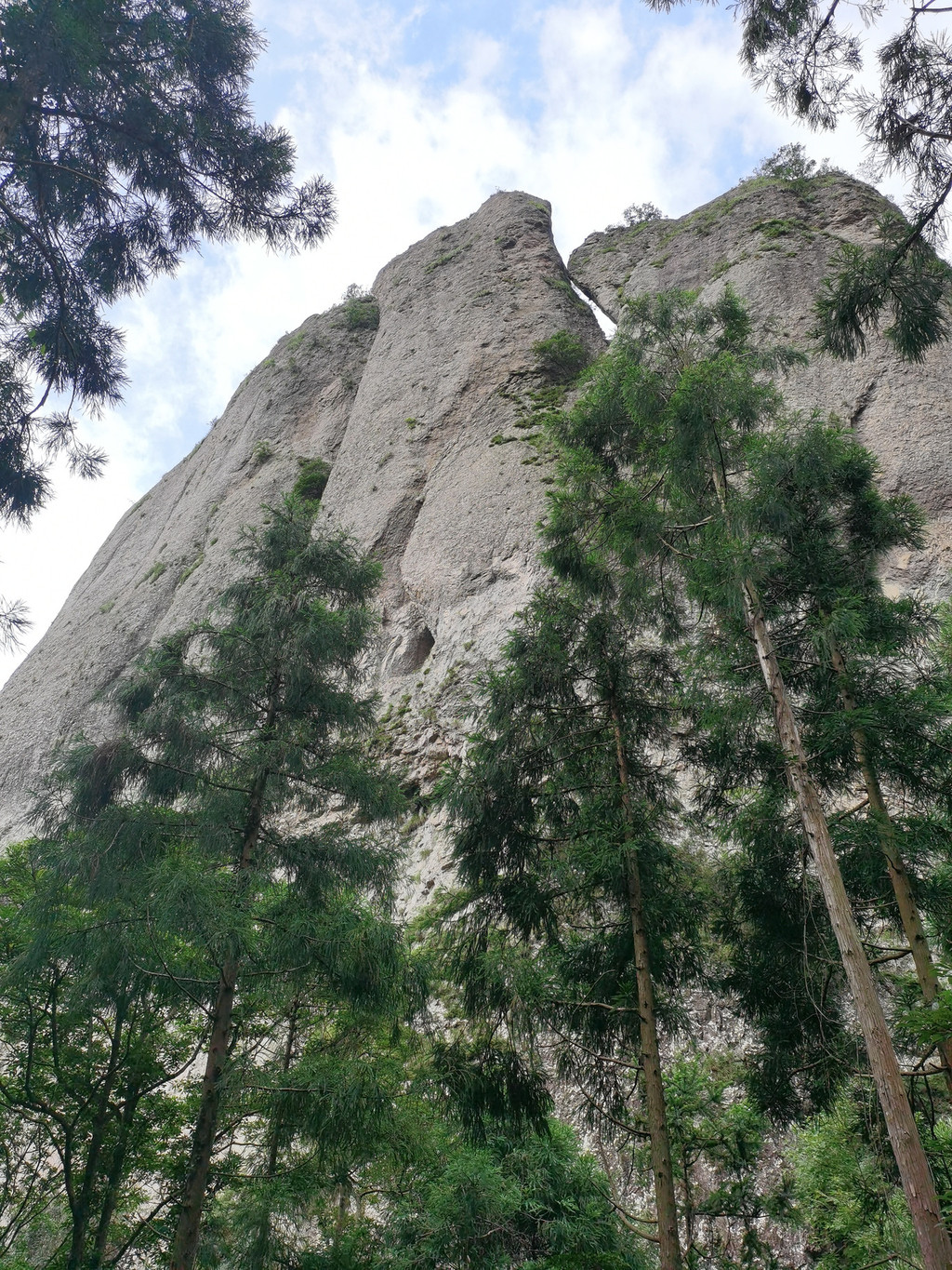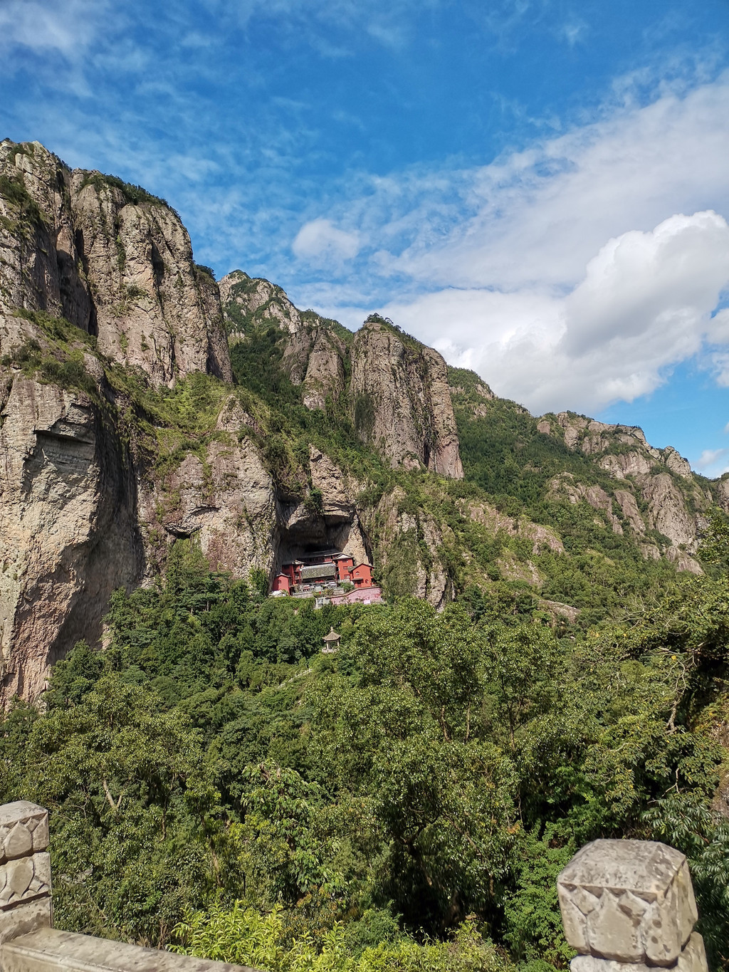 第三天去看灵峰的日景,大概是把晚上不让爬的地方走一遍,约半小时到好运洞,洞里居然有蝙蝠,没有准备被吓了一跳,之后就是真正意义上要爬山了,在往里走约半小时到北斗洞,北斗洞是一个背靠岩洞而建的道观,远看屹立在崖壁半腰,再爬十多分钟到观音洞,从寺庙门开始台阶一直往上走,观音供在一个巨大的山洞里,两边的岩壁从头顶之上裂开,原路爬下来时脚已经废了,旁边还有一个尼姑庵。