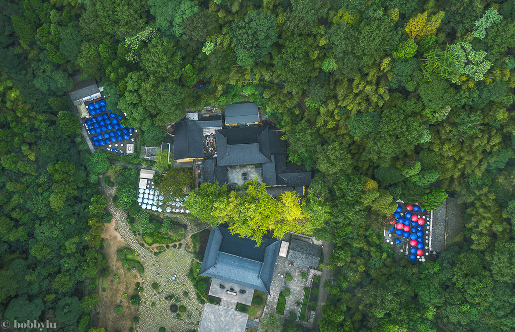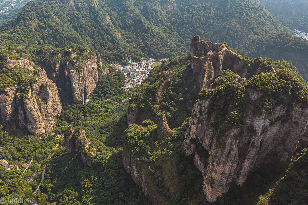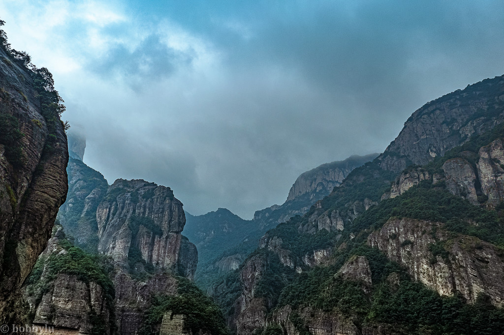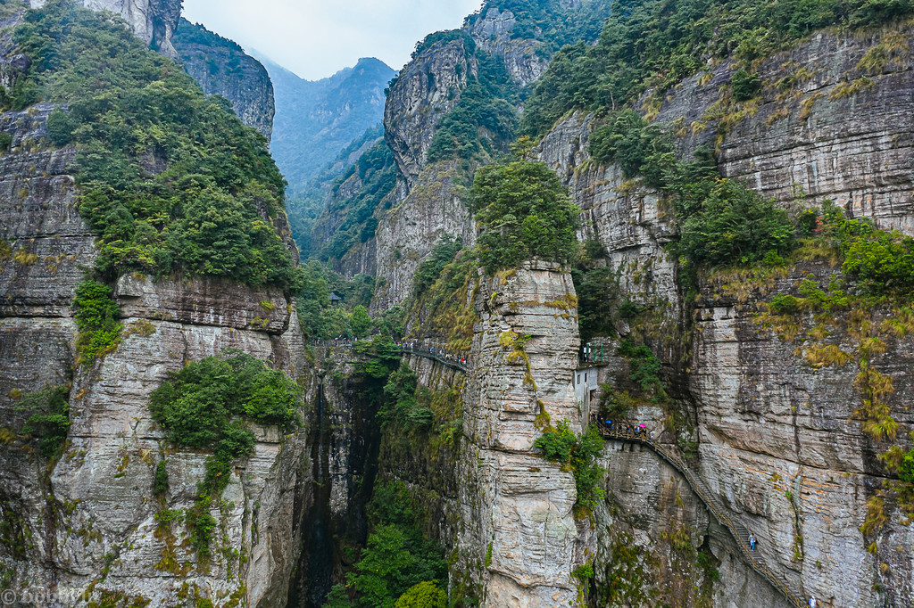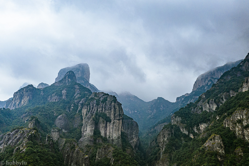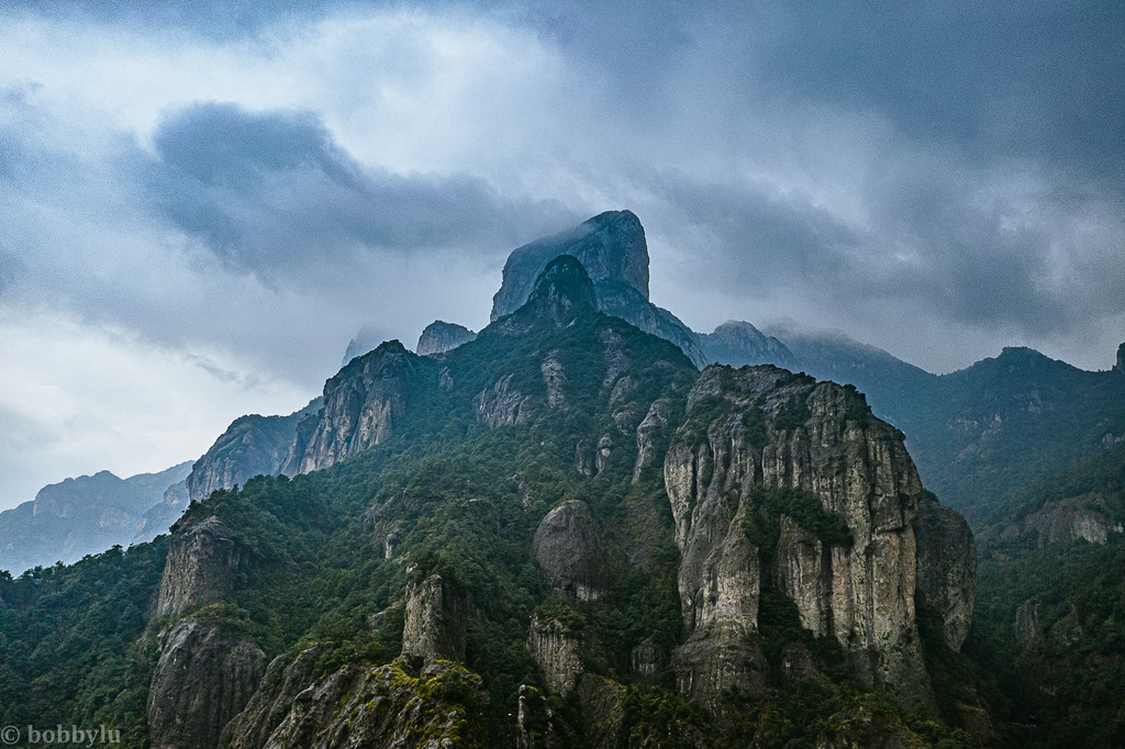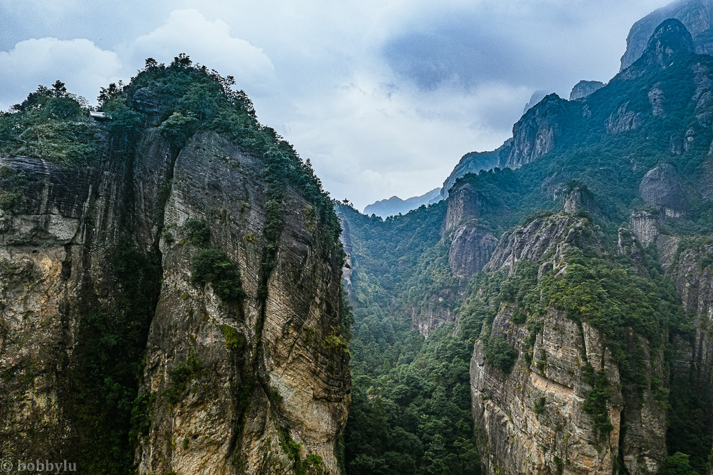 从上面的图片可以看出,无人机航拍视角下,山峰突兀陡峭、山体怪石嶙峋,远望层峦叠嶂、近看气势磅礴......由于天气原因,天色青灰,阴云密布山体与天同色,毫无苍翠生机之感,少许的压抑、进而有些恐怖,逐渐形成了巨物崇拜般的迷恋这山形、山势、山石以及参差嶙峋的骨感之美......总而言之、就是很难想象徐霞客当时在没有完善的行进道路及相对安全防护措施下是如何攀登的。