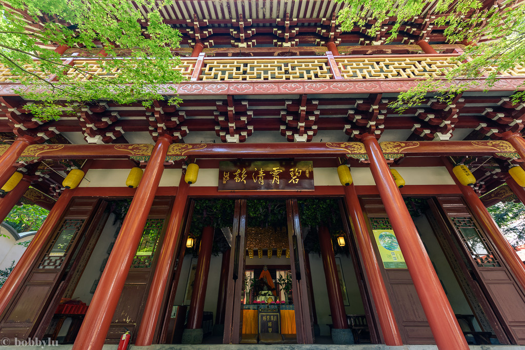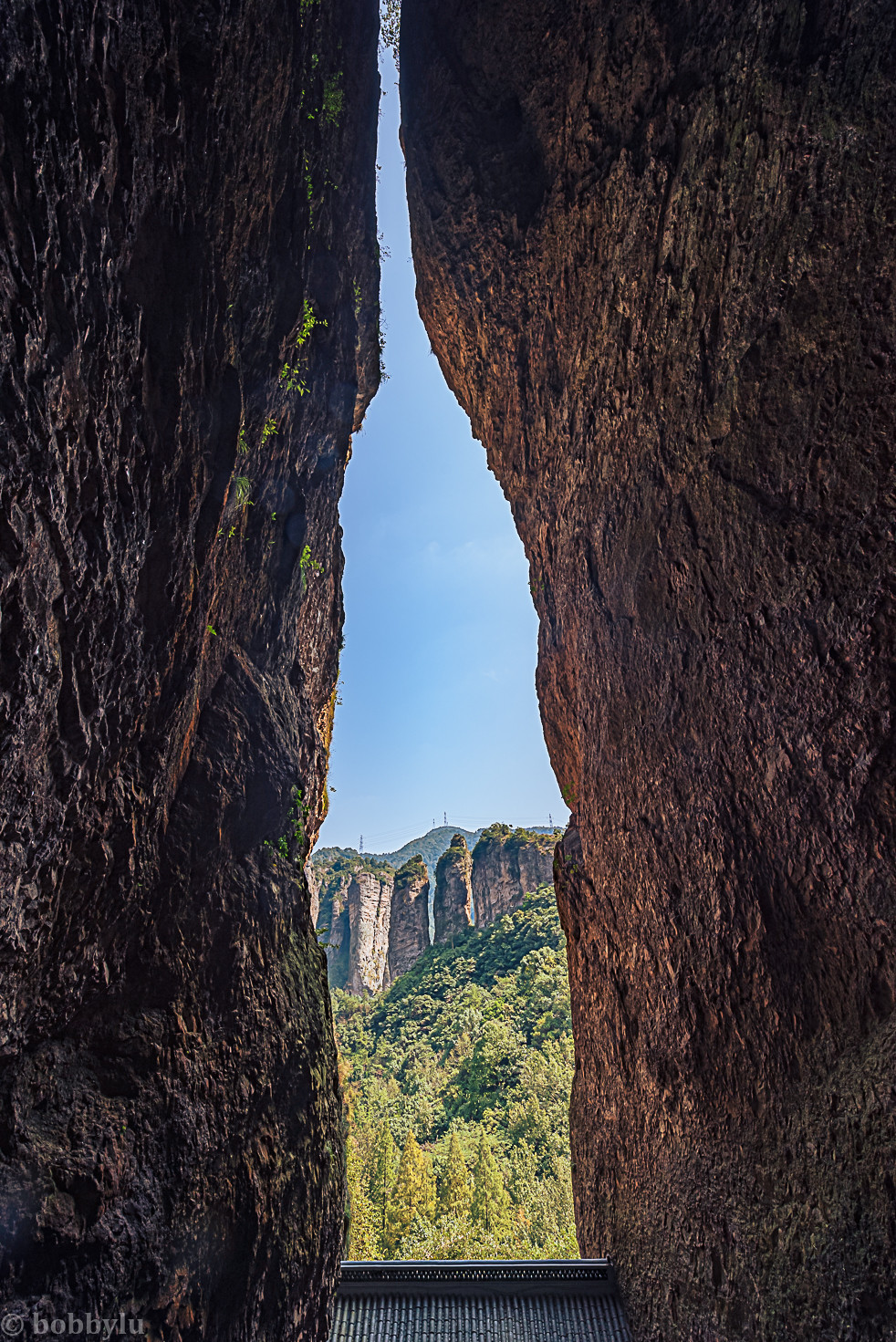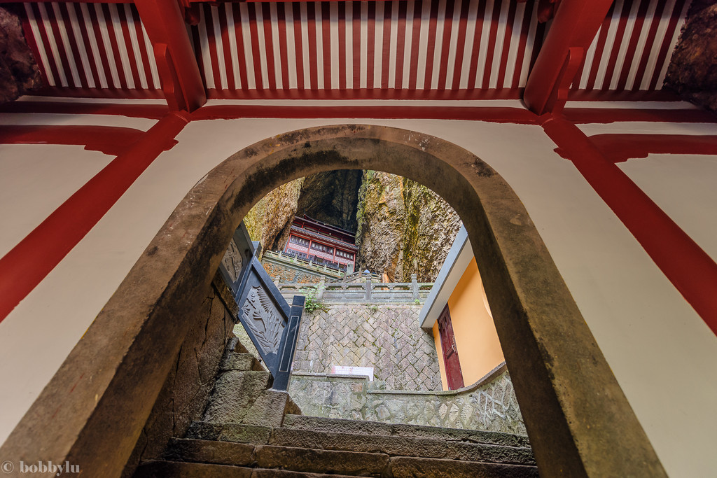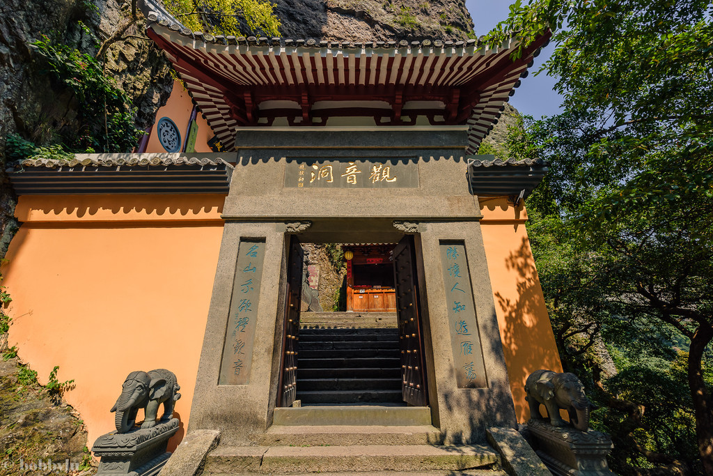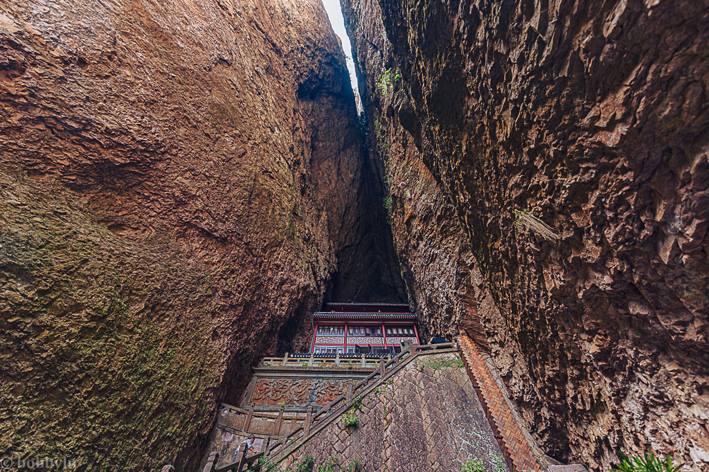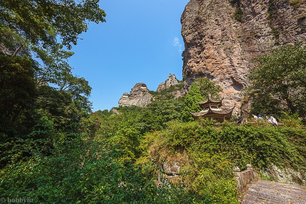 而在这些奇峰峻岭组成的山间,更藏有多座庙宇佛堂。最令人叹为观止的则是架在两山之间、悬于绝壁之下,也就是在合掌峰下的位置,依山势岩石构筑一座空中楼阁,这里便是观音洞。整个洞就好似一个天然形成的大型石室,但想要走进去欣赏,必须要行走于高耸的台阶沿山势而上。整个建筑看上去庄严肃穆、气宇非凡,造型华丽更显雕梁画栋之精雕细镂之功。