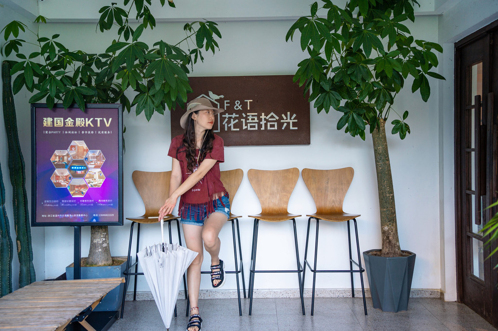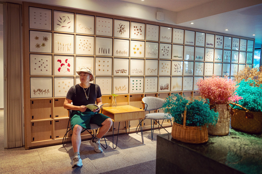 这间民宿常年盛开各季花草:三月间油桐花双姝争妍,五月天茉莉香气袭人;七月蓝雪花盛放,十月三角梅渐次入景,马鞭草花期最长,自春末至冬初,将这里装点成紫色的海洋。