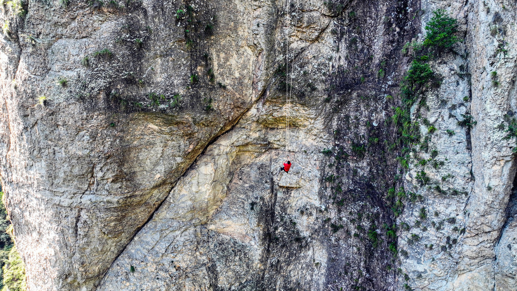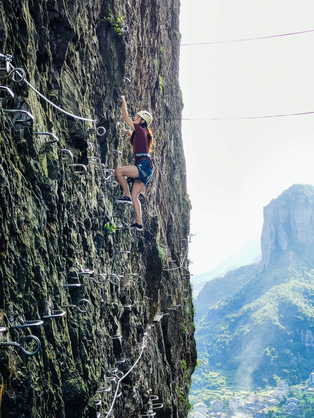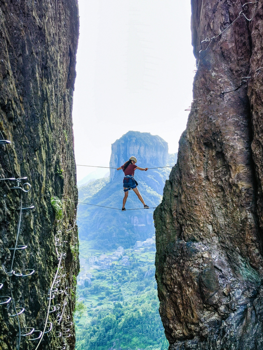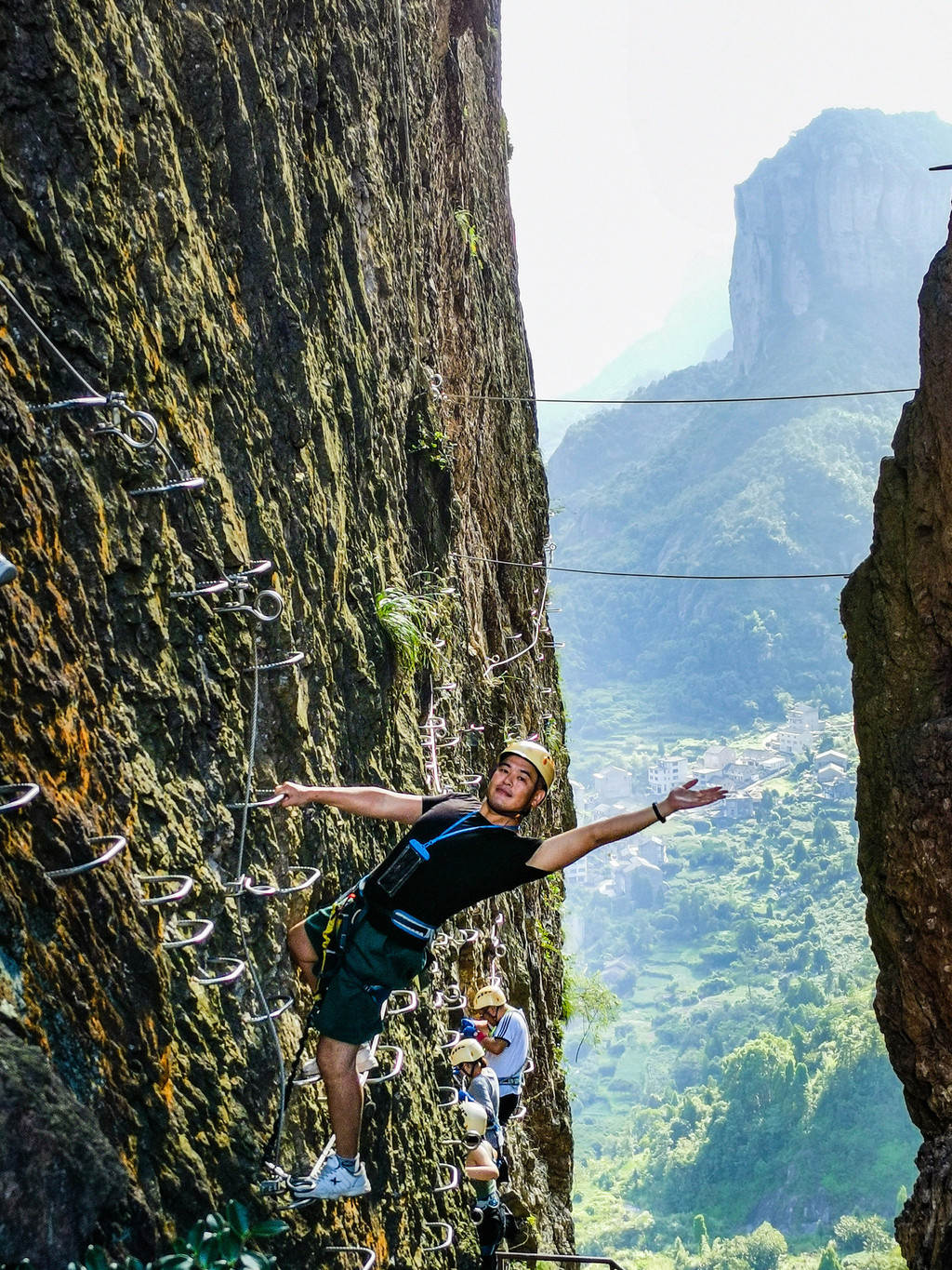 想要体验先要爬40分钟左右的山,到达体验平台,在这里领取专业的攀岩保护装备,穿戴头盔及手套,然后教练会讲解注意事项,虽然是在悬崖高空行走,但有绳索将你牢牢绑在安全绳上。