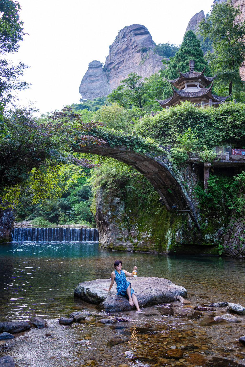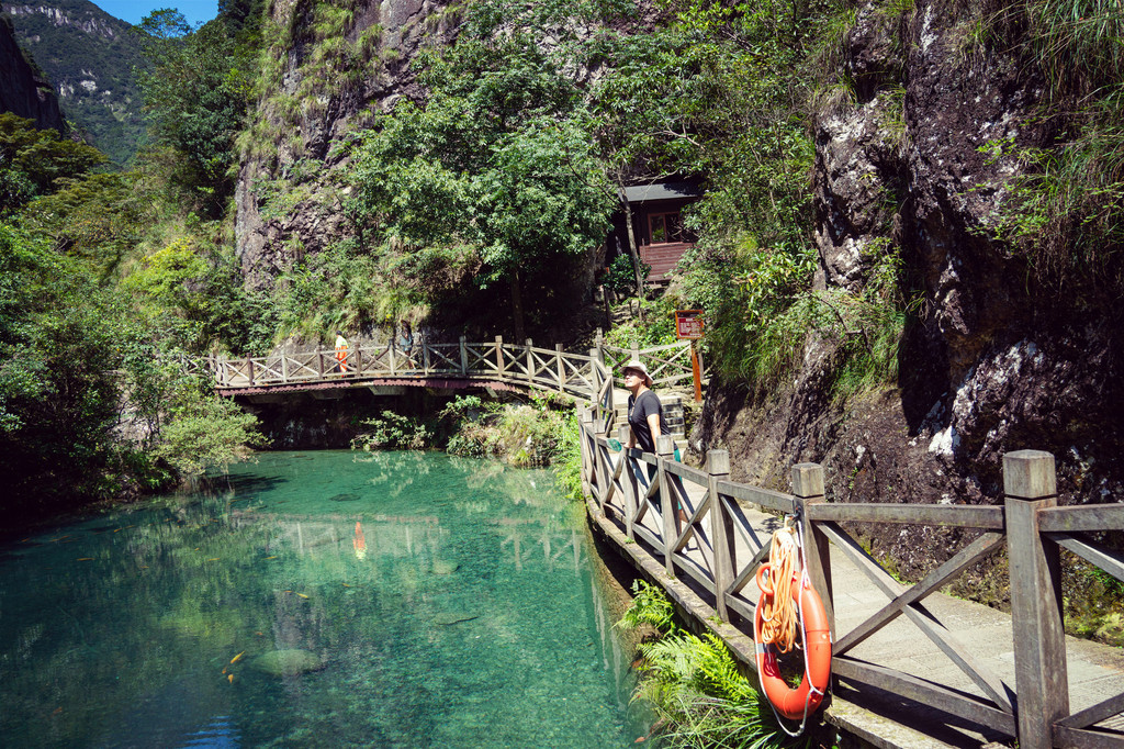 走进灵峰景区,首先来到池水澄碧的凝碧潭,它仿若一块翡翠镶嵌在果盒岩与渡船岩之间,静静地流淌着千年的光阴。绿树森森,果盒桥横跨碧波之上,这是《琅琊榜》中出镜率超高的古桥,既有江南小桥流水的秀气,也有独属雁荡的那份不羁洒脱。来吧,就让我们追觅《琅琊榜》里“江左梅郎”踏过的足迹。