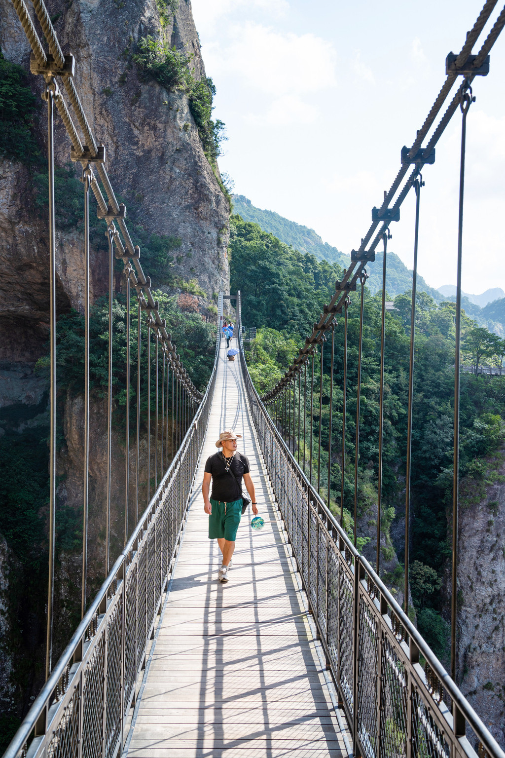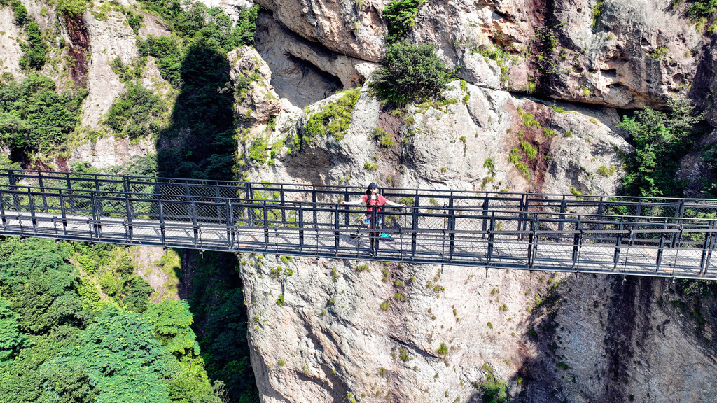 我最喜欢两山之间,百余米长的天空之桥,走在上面还会随着步伐微微摇晃,这座铁索桥离地面足有200米高,带来惊险刺激的心跳感。