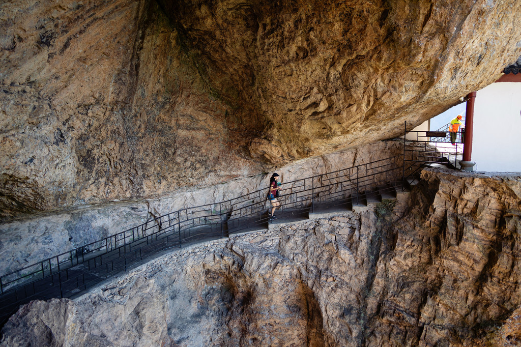 这是一处在高达百米峭壁间开凿出来的方型栈道,故而得名。它有个浪漫的名字“银崖天廊”,远观就像一条腰带挂在半山腰。