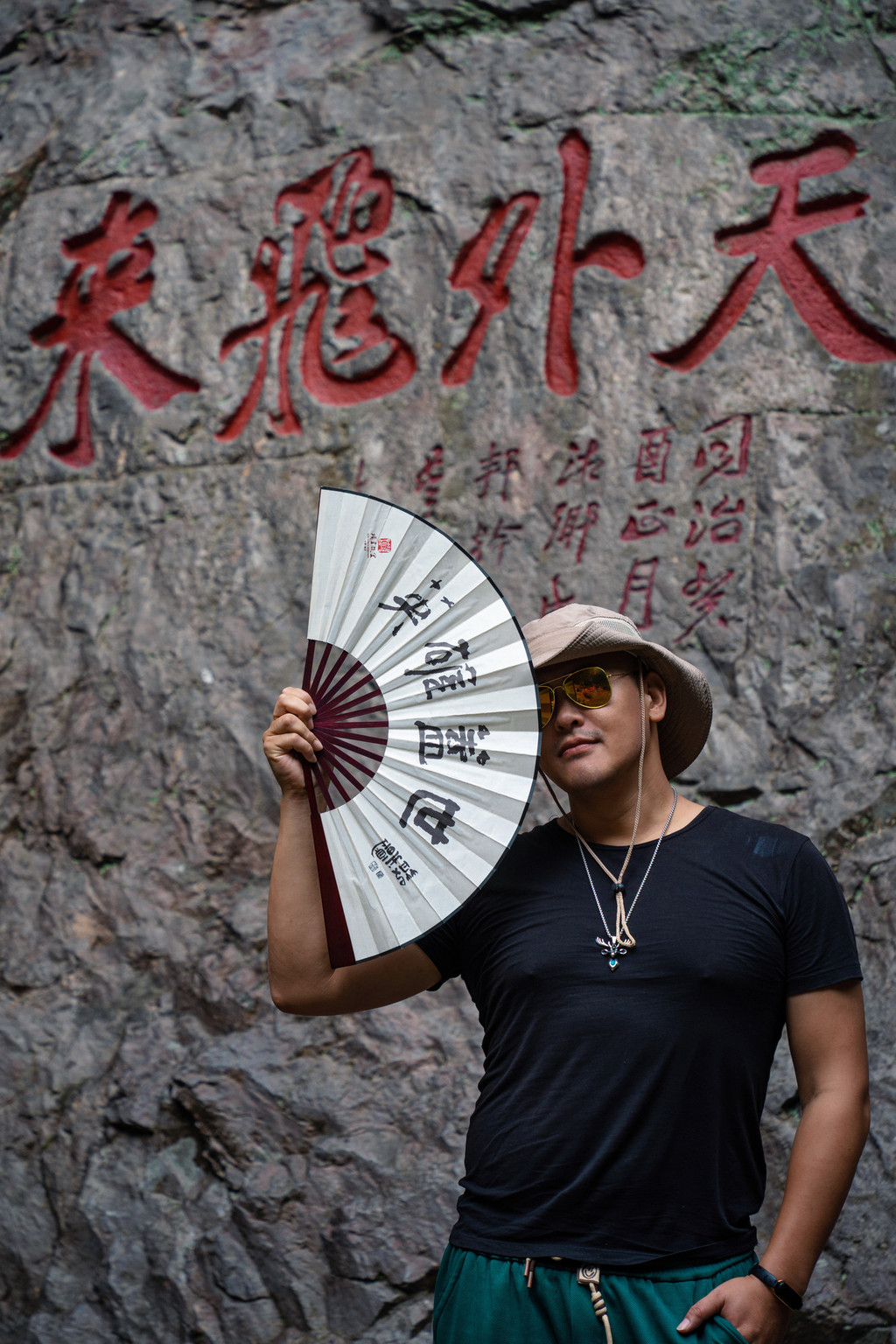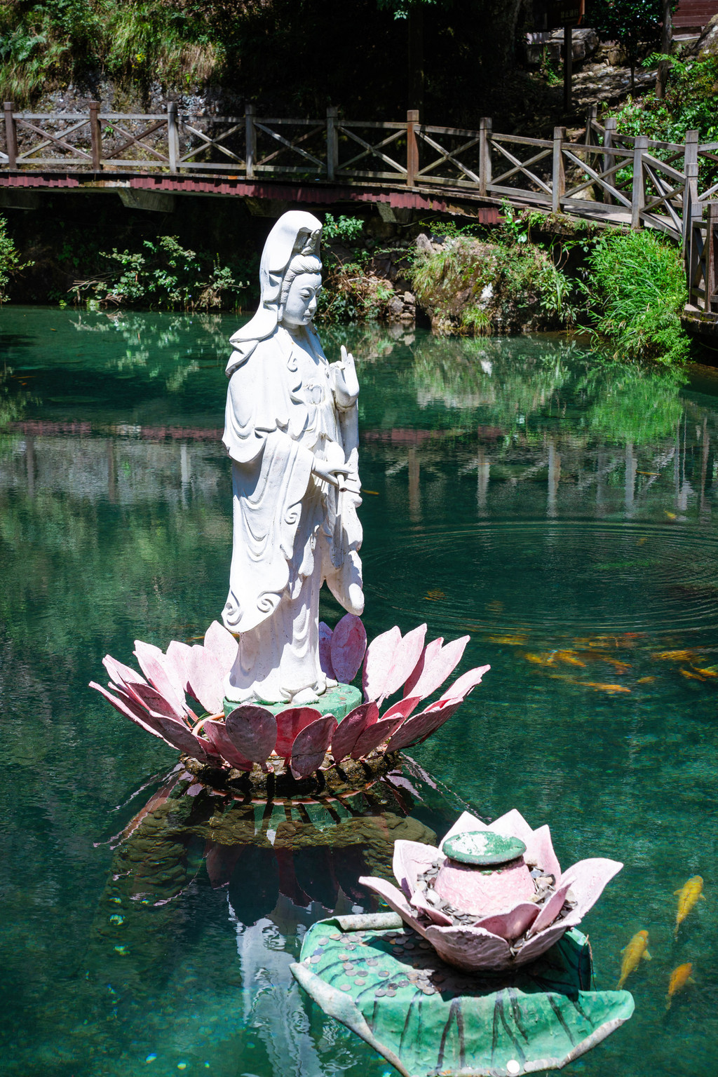 让我们沿台阶攀山而上,经过独秀峰旁的玻璃栈道就来到这里,绝壁之上小龙湫飞泻而下,龙口之上是一碧潭,一尊白玉观音居其中,数尾红鲤悠悠游弋,一派仙山幽谷之气象,完美还原了神雕侠侣那海誓山盟的场景。