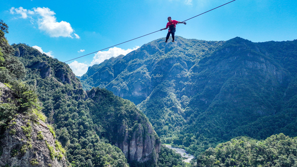 首先是从挂着绳索,从山顶飞降而下的竖渡,身手矫健似猿猴,展现了雁荡山居民灵岩采石斛的场景。接下来会有特技表演者,从天柱峰和展旗峰的绳索间(高达200米,宽亦200多米)表演横渡,还会在绳子上表演翻跟斗,脚下就是万丈深渊,看得人胆战心惊。