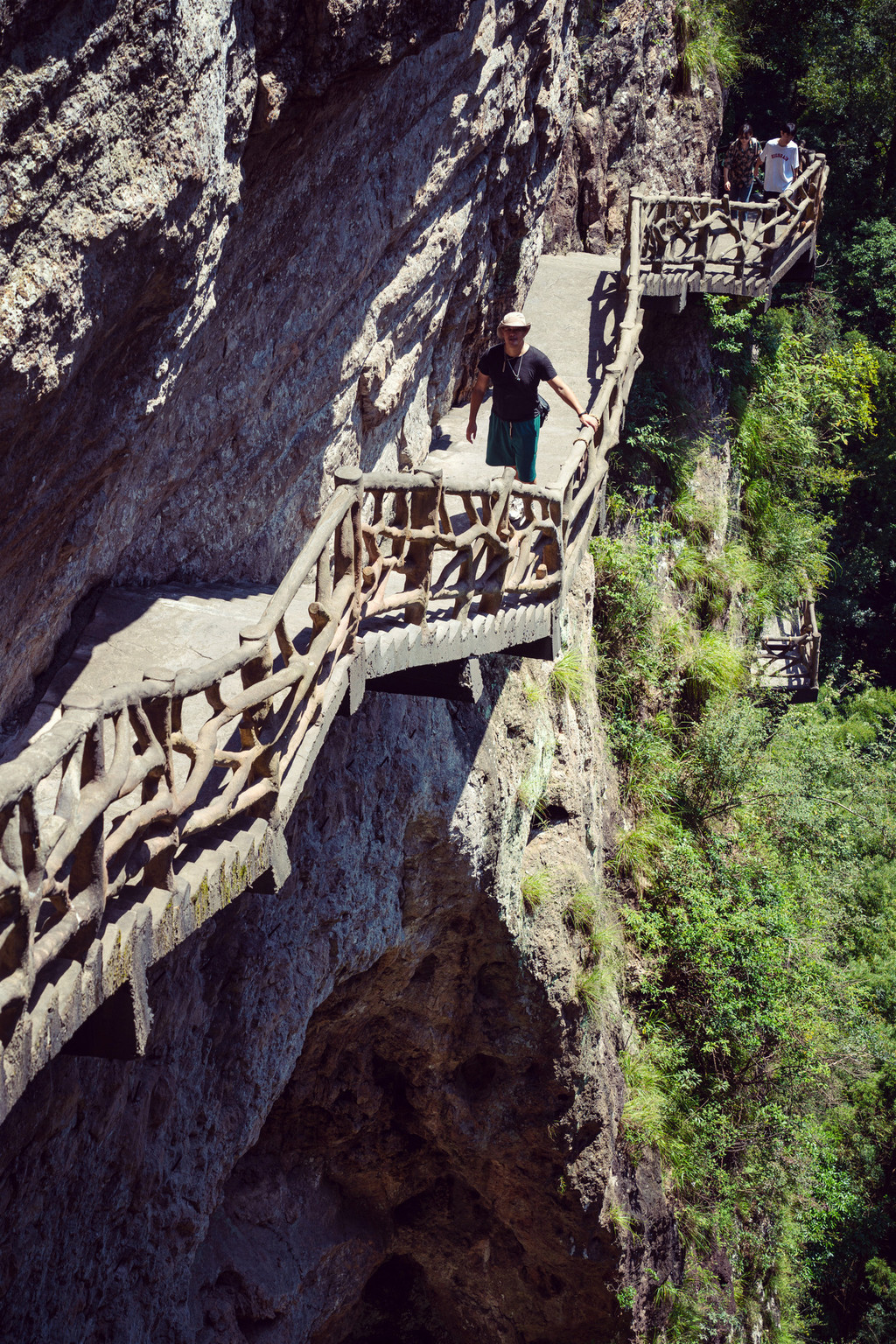 在这里头顶巨石,手扶栏杆,崖下是百丈峭壁,侧边是奇峰怪石,险峻非常。若遇晨雾,云海翻腾,群峰更添几分缥缈神奇。沿途依次可观赏关刀洞、云天桥、倒挂金钟、梅花洞、聚仙阁等景观。