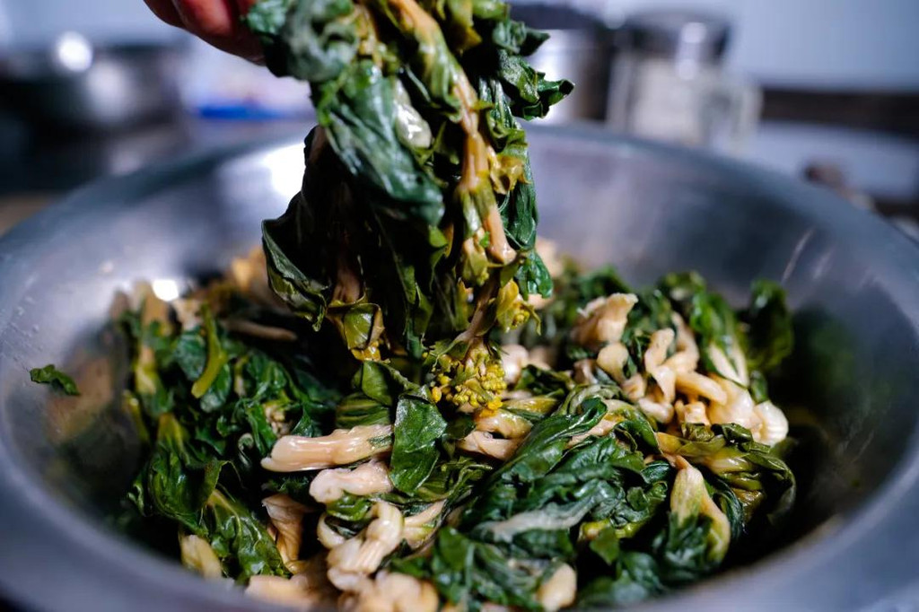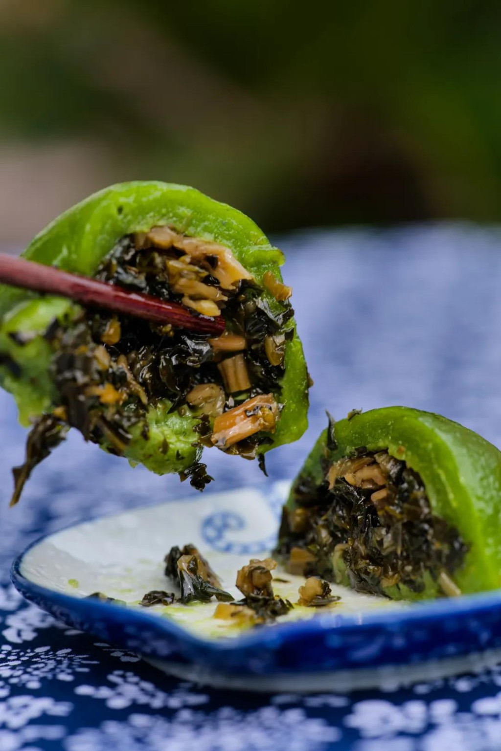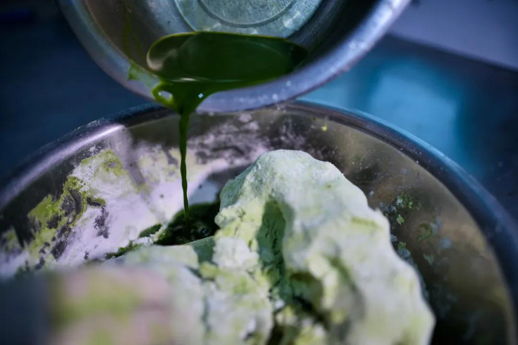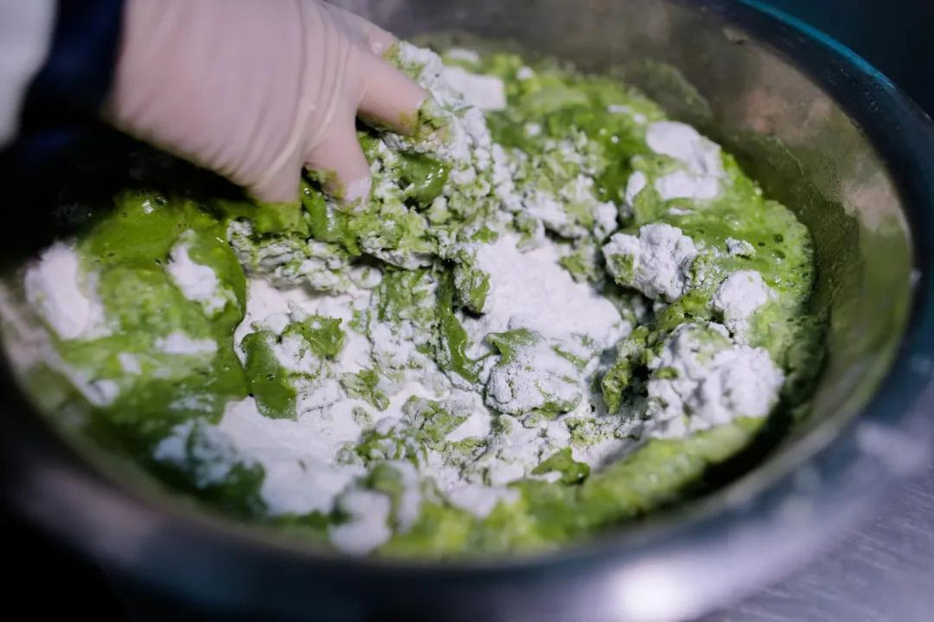 和粉很讲究,撒粉和浇汁全凭个人经验,需要让每一粒米粉都饱吸青汁,就像一对热恋中的男女,满眼满心的都是你侬我侬的深情。