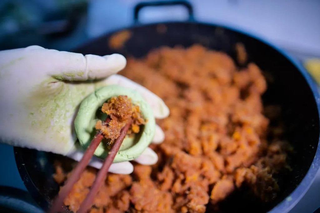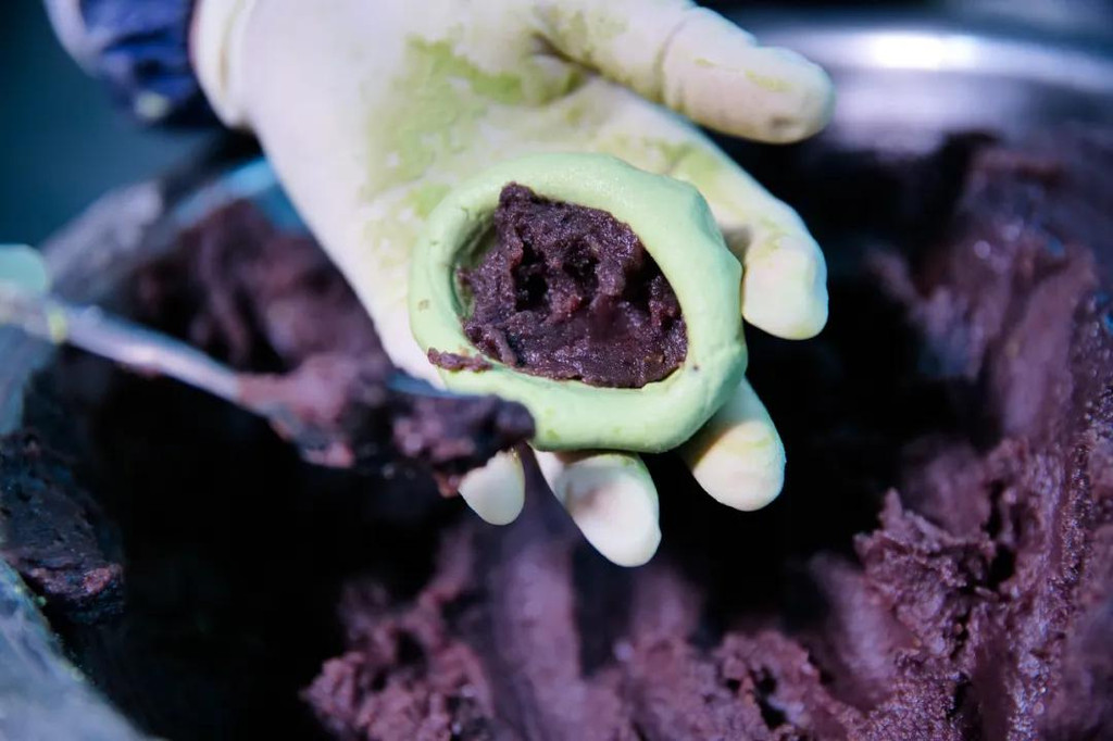 青团的馅能够看出生活的富足,从早期单调的青菜、野菜等,到后来白糖猪油芝麻,再到现今的玫瑰豆沙、桂花豆沙、蛋黄肉松,火腿海鲜,一切味蕾能够满足的食材都能用来做馅。