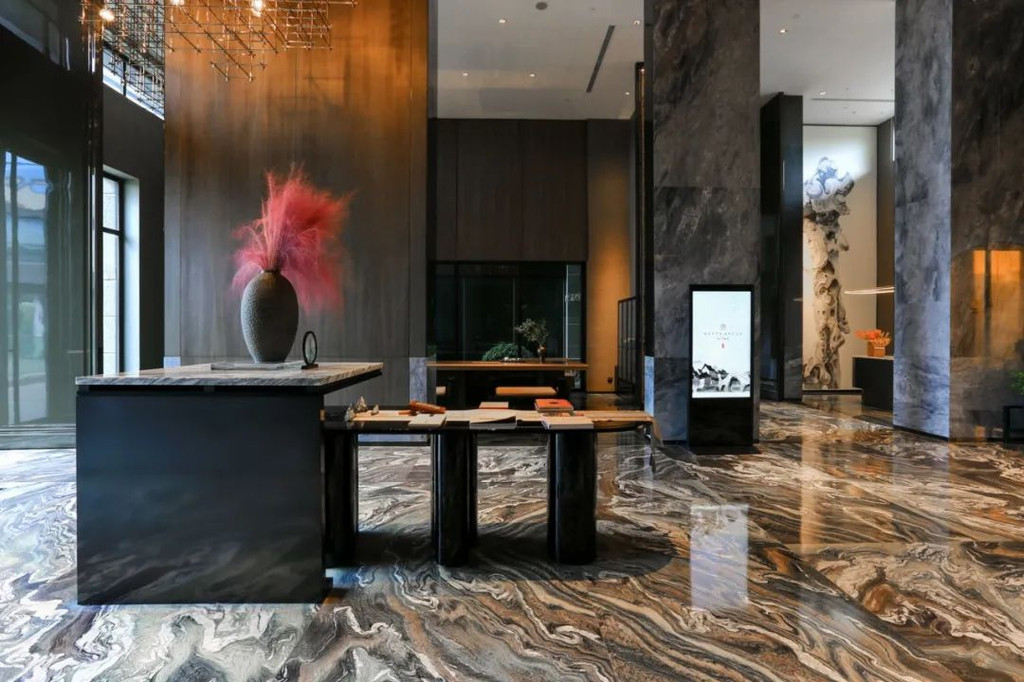 大堂左翼是酒店的前台,尽头有一幅非常显眼的铜版镂刻画《姑苏繁华图》,而前台对面的墙面上,令人熟悉不过的水乡古镇地面的石板路花纹,都在提醒着客人:这里是苏州。