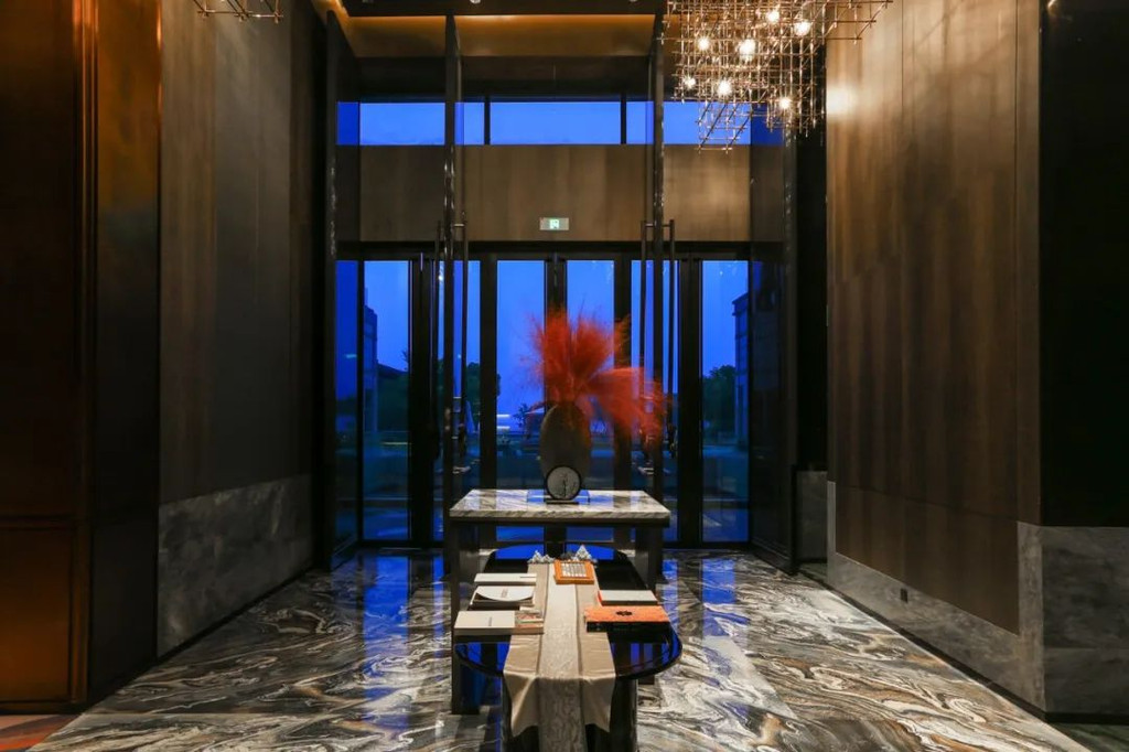 落地窗外是景观草坪,而大堂里惬意的休闲空间里装饰着粉黛草和活字雕版等文化装饰,表达着古典而文雅的美学态度。